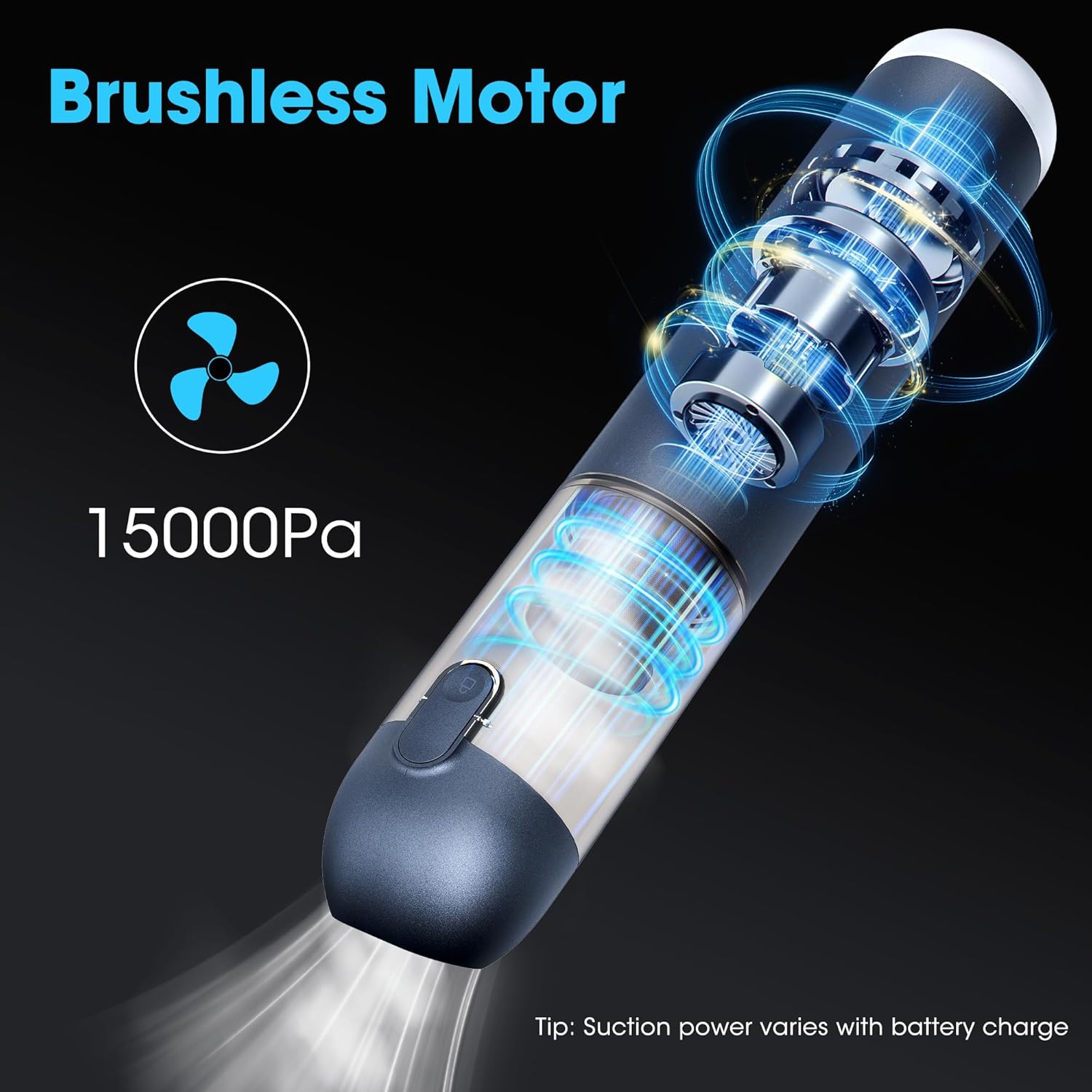 【High Power】This car vacuums with best suction cordless is equipped with a brushless motor that offers 15000Pa of suction with low noise, low energy consumption, high power and long service life compared to conventional brushed motors. 【4-in-1 Multifunction】Our portable vacuum cleaner is equipped with 4 modes of vacuuming, blowing brushing and exhausting to meet your different needs, while the vacuum cleaner is used in conjunction with our professional tools and can also exhaust the vacuum storage bag. 【LED Lighting and USB-C Design】This car vacuum cleaner has two lighting modes, white light can be used as flashlight, red light can be used as warning or emergency light, giving full play to one thing…