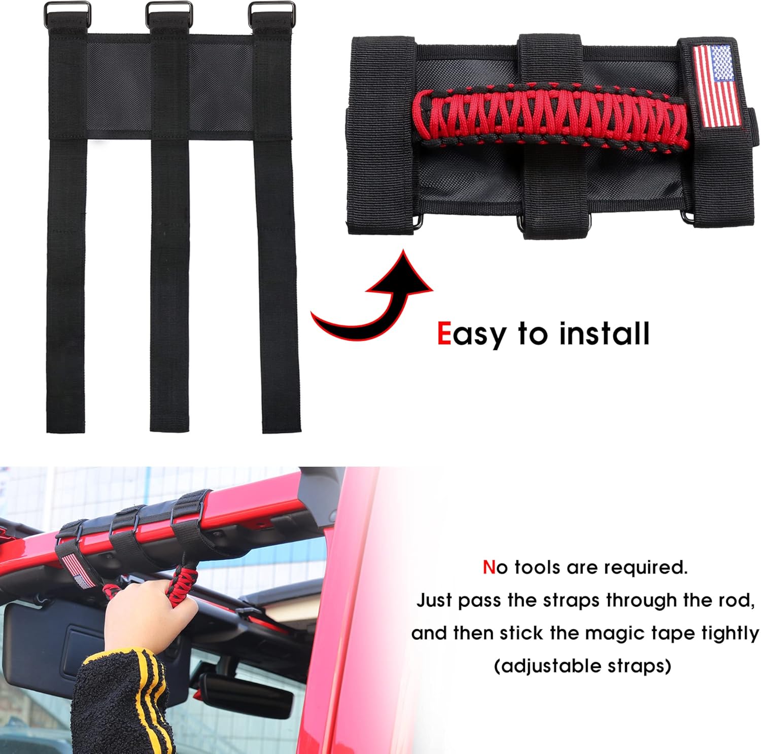 【FITMENT】For Jeep handles grab fit 2.0-4.0 inch roll bar 1945-2023 Jeep Wrangler CJ YJ LJ TJ JK JL accessories 2 door 4 door & Jeep Gladiator JT accessories, ATV, UTV (Does not work with sky one touch roof, Not for 2024+ up). 【SUPERIOR MATERIAL】For Jeep Wrangler accessories made of the thickened paracord grab handles, metal buckle, waterproof oxford cloth, Resistant to pull, sturdy durable. Suitable for the rear of JL cars and all wrangler roll bar padding. 【GOOD PERFORMANCES】 For Jeep roll bar grab handles can help to remove the insecure feeling when traveling without doors and nothing to grab on to. Provide you with strong support as you get on or off the bus or encounter bumpy roads…