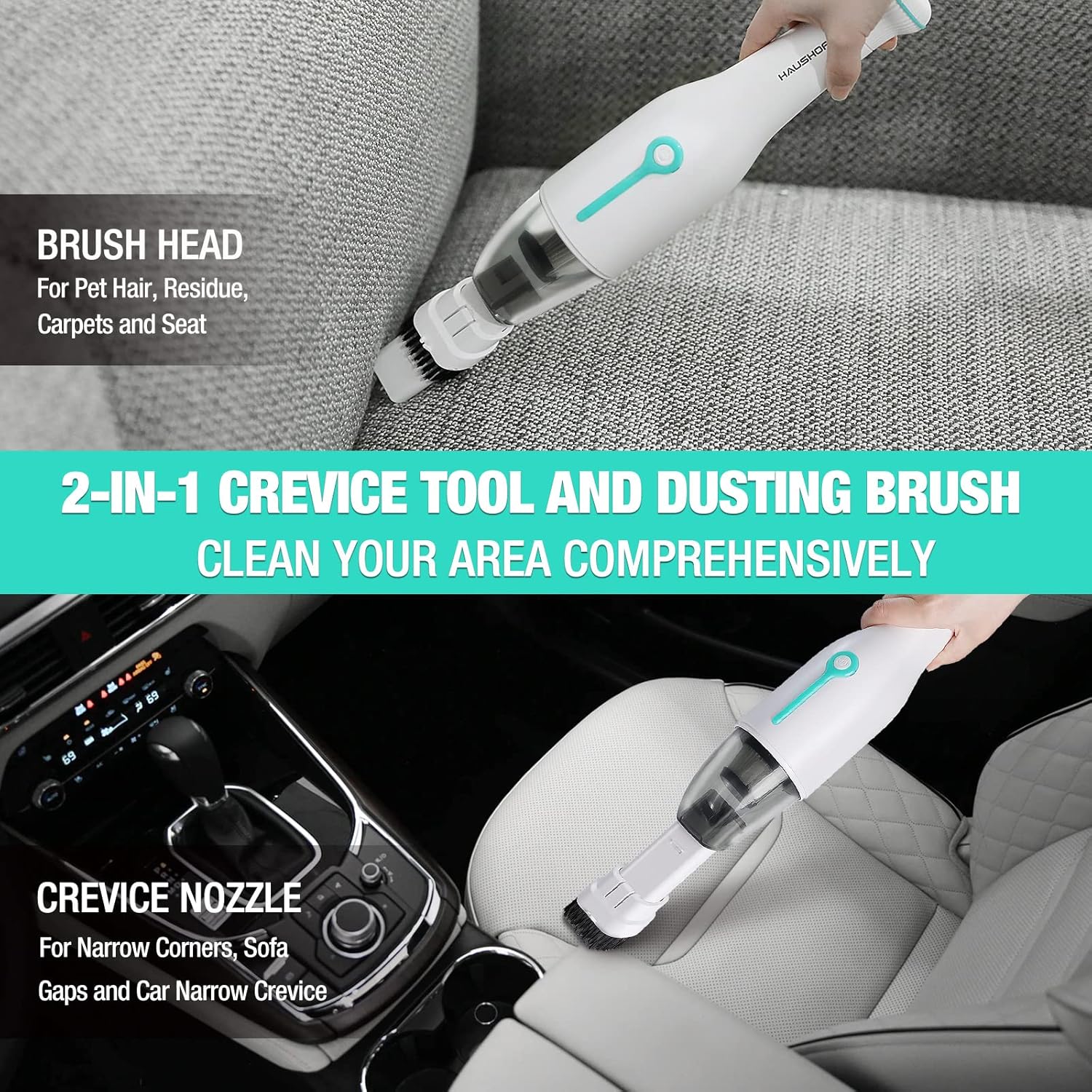 - Portable Lightweight Vacuum: Wireless design provides more convenience and makes it easier to clean hard-to-reach places. Come with 2-in-1 crevice tool and dusting brush helps to clean your car and home more comprehensively