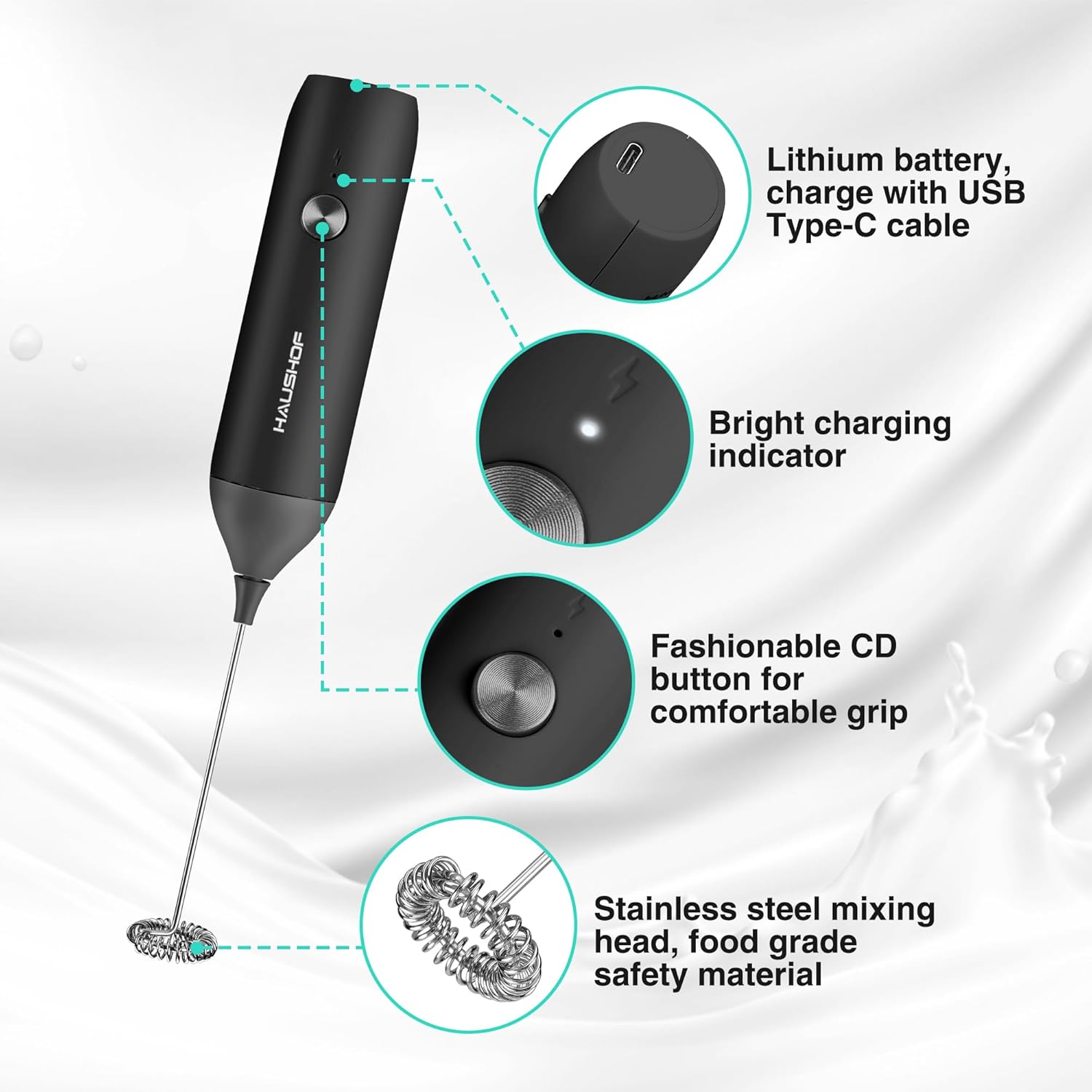 - What You Get: Included in our package is a rechargeable handheld milk frother along with 1 TYPE-C charging cable. Please be aware that our powerful rechargeable frother may cause liquid splashes. To avoid any spills on your desk, clothes, or surrounding surfaces, we recommend using a larger and taller container. Kind reminder: Do not leave the milk frother unused or uncharged for a long time to avoid damage to the battery