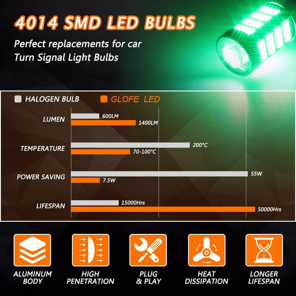 92pcs high power & high brightness 4014SMD LED chips, 360 degree light output; Voltage: 12V-24V, Color: Green. Built-in IC Circuit of wide and low voltage Range 12V to prevent LED Bulb from being damaged by voltage variation and spikes.. For some European vehicles, it may require to avoid the load resistor or decoder to avoid the error code on the dashboard or malfunction….