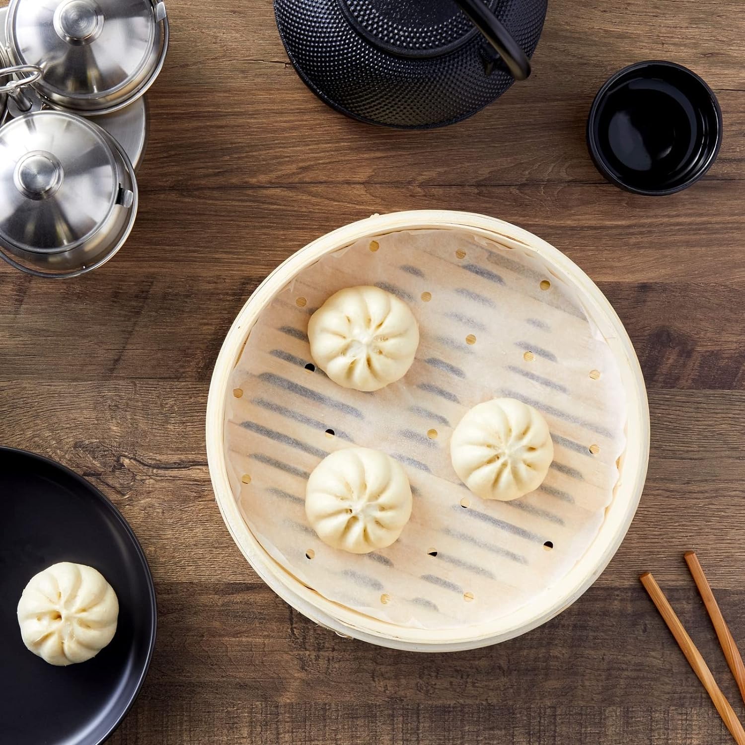 Steamer Basket Essentials: This set of 100 white translucent steam paper liners with holes allows for optimal air circulation in round steamer baskets while keeping food hot and residue-free. Maintain Freshness: Perfect for preserving the heat and freshness of bread, dumplings, buns, egg rolls, and dim sums, these steamer paper for dumplings withstand temperatures up to 428 degrees Fahrenheit. Versatile Fit: With a 10-inch diameter and 39gsm weight, these air fryer paper liners are designed to fit seamlessly into standard 8-inch round air fryer baskets, enhancing versatility across kitchen appliances…