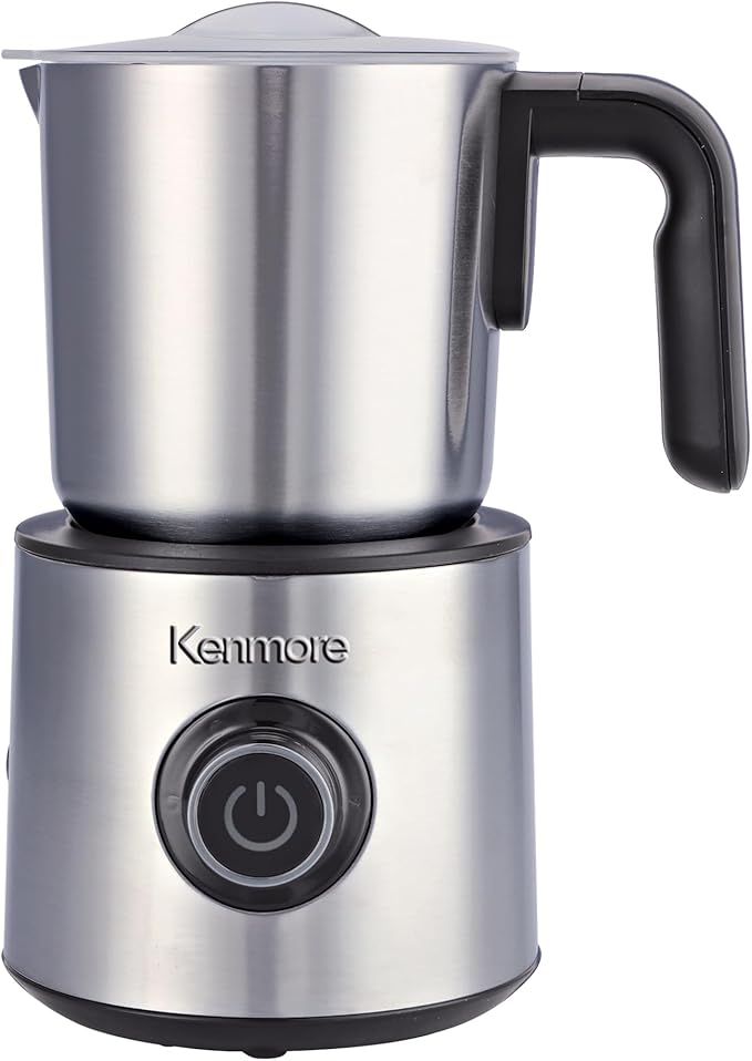 4-IN-1 HOT & COLD MILK FROTHER AND STEAMER – The Kenmore electric milk frother and steamer offers four versatile functions: hot foam, cold foam, steamed milk, and warm milk. Perfect for lattes, cappuccinos, macchiatos, iced coffee, and hot chocolate, this multifunctional milk frother for coffee ensures barista-quality drinks at home. Ideal for creating rich foam or smooth microfoam for any beverage.. 16OZ DETACHABLE STAINLESS STEEL PITCHER – Includes a large 16oz stainless steel milk pitcher for easy frothing and steaming. Dishwasher-safe for effortless cleaning, this milk frother handheld design makes it convenient for everyday coffee routines. Perfect for preparing hot milk, cold foam, and creamy froth for cappuccinos, lattes, and other coffee drinks.. QUIET ELECTRIC MILK WARMER FOR COFFEE – Enjoy a calm coffee-making experience with this quiet milk frother and warmer that heats milk quickly without noise. Ideal for early mornings or late nights, it works perfectly for hot chocolate, lattes, cappuccinos, and macchiatos. This electric milk frother ensures smooth operation while delivering consistent results every time….