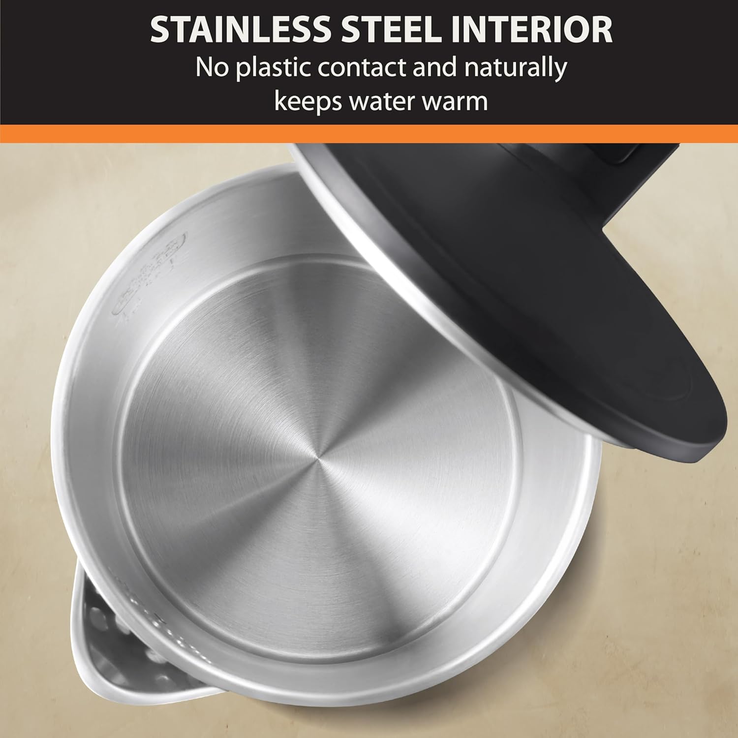 - STAINLESS STEEL INTERIOR: The stainless steel electric kettle has no plastic contact and naturally keeps water warm.
