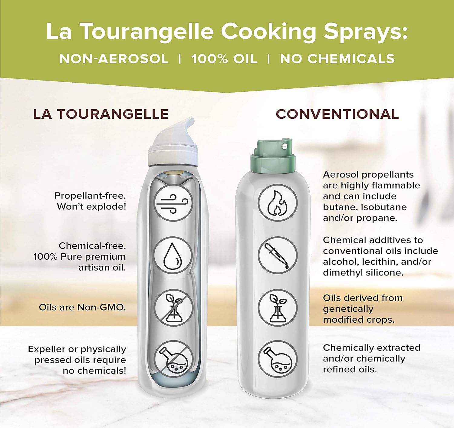 - Pure Artisan Oil in Spray Form: La Tourangelle Artisan Cooking Sprays are non-aerosol, chemical-free, and alcohol-free sprays, providing you with easy application and quality you can taste.
