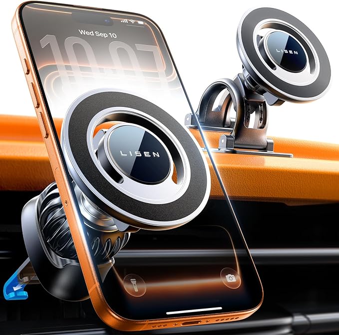 4-IN-1 PACKAGE: Includes an adjustable steel hook mount for air vent, a 360° rotatable duo-stand mount for curve/flat dashboard, 3M dashboard stick pads, and 2* magnetic rings for non-magsafe device. STABLE, DURABLE: Graphene 3M 66lbs adhesive force stickpad ensures stable mounting, eliminating worries about mounts shaking/loosening while driving. The 20 units N55 (2X Stronger) magnets are moulded 1:1 as the official MagSafe construction, guaranteeing a strong and long-lasting magnetic force for holding the phone tightly. Snap and enjoy your drive. MAGSAFE ORIENTED: LISEN for MagSafe car phone holder is designed for both MagSafe and non-MagSafe devices to enjoy the convenience of MagSafe tech. Patented LISEN magnetic car mount offers exclusive MagSafe experience- 0 harm to device battery, undisturbed phone signal, graphene heat resistance and dissipation layer holder for safety. Perfectly aligned fits iPhone holder for car…
