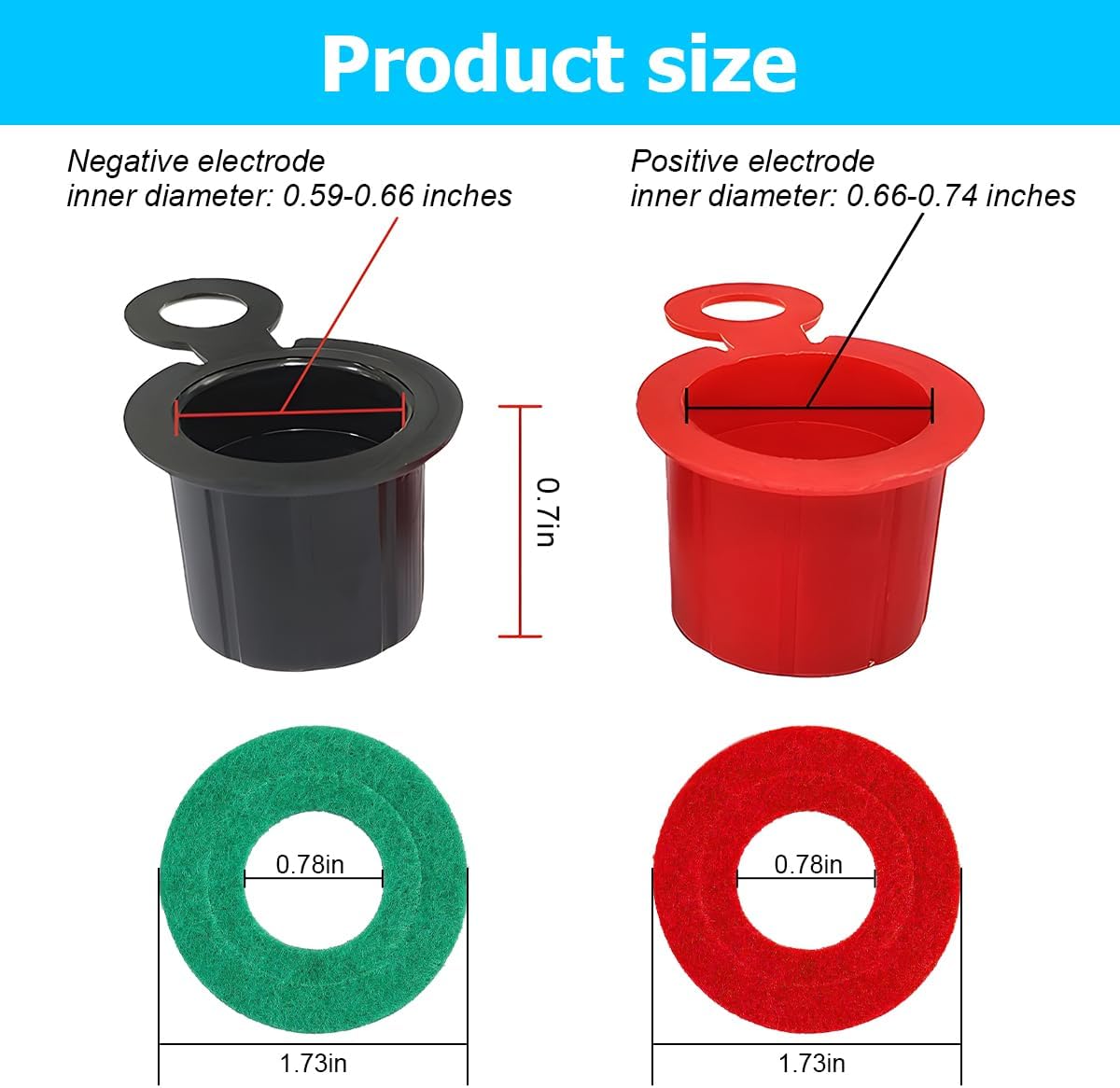 - Package Include: Our product package includes 4 (red and black) top plastic battery terminal covers and 4 (red and black) gaskets which are capable of being used for positive and negative battery terminals. The positive battery terminal cover has an inner diameter size of 0.59-0.67 inches and the negative battery terminal cover has an inner diameter size of 0.67-0.74 inches and a height of 0.71 inches.