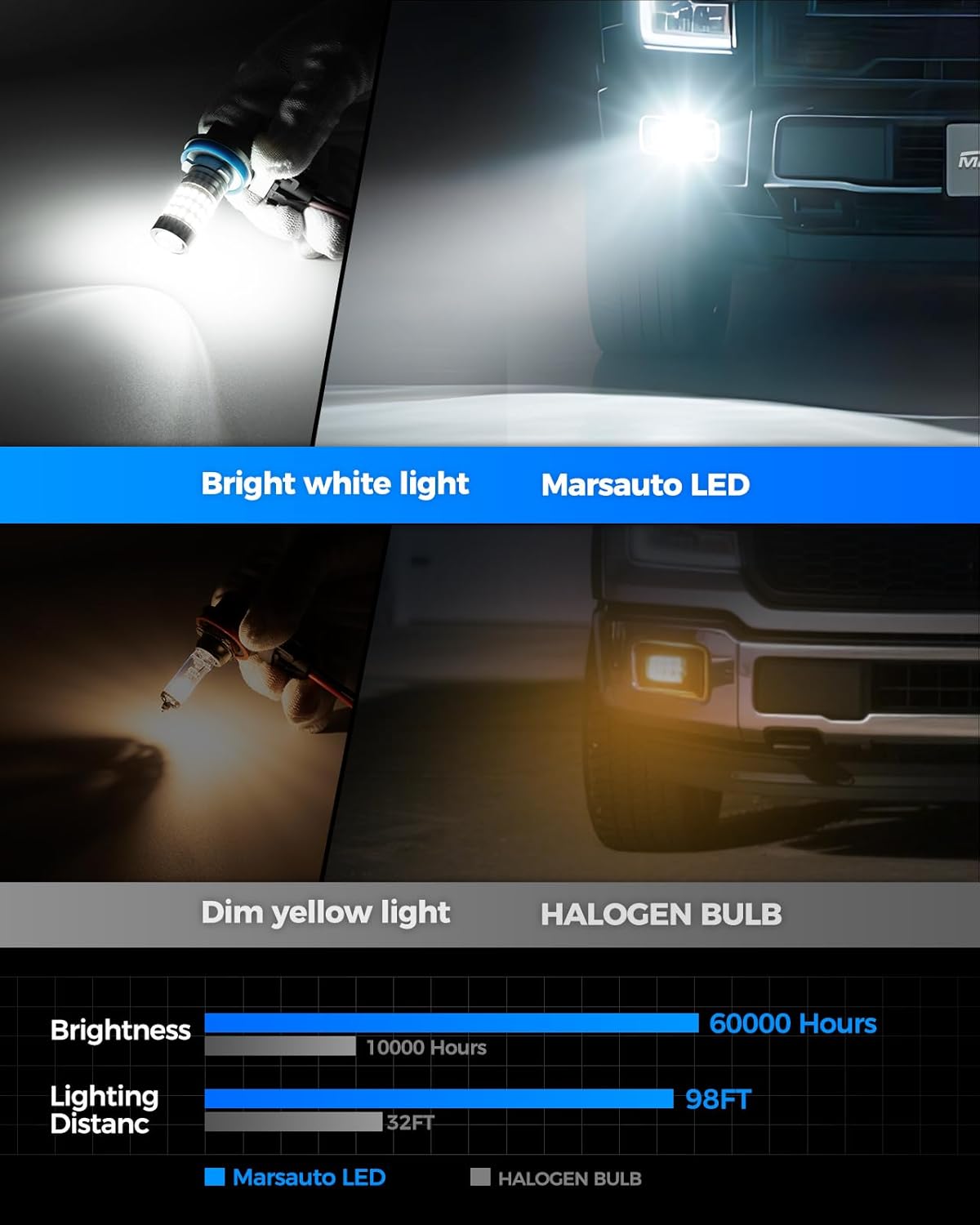 - Upgraded 96 LED Chips/Set: Marsauto H11/H8 LED Fog Light Bulb deliver 10,000LM/set luminous output with 6,000K white light, improving visibility by up to 600%—the ideal choice for fog, rain, snow, and other harsh weather conditions, RV Exterior Lighting