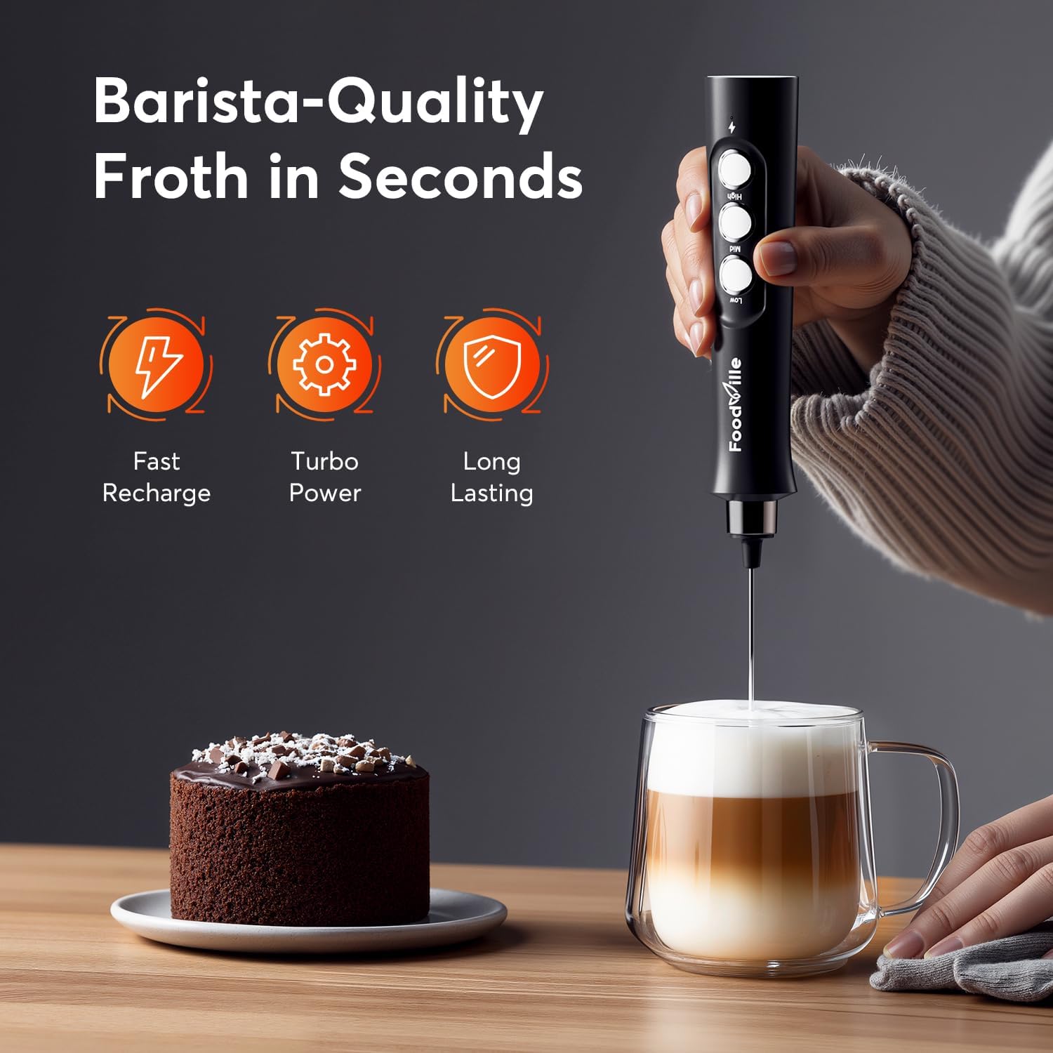 Professional Kitchen & Barista Tool: With 2 versatile whisks, the FoodVille electric milk frother is one of the best kitchen essentials to make the perfect milk foam for your morning & afternoon coffee, and to help you get smooth batter consistency & fluffy whipped cream in 5 minutes.. Multiple Whisking Speeds: 3 Gears allow you to choose the proper whisking speed from 19000rpm, 21000rpm and 23000rpm. The higher speed you choose, the less time you will spend, and the thicker foam you will create.. Great Power, Remarkable Durability: Equipped with an innovative, super premium motor, the must-have handheld foam maker gives long-lasting and reliable performance. Double layer design whisk ensures that you get silky and creamy milk with ease….