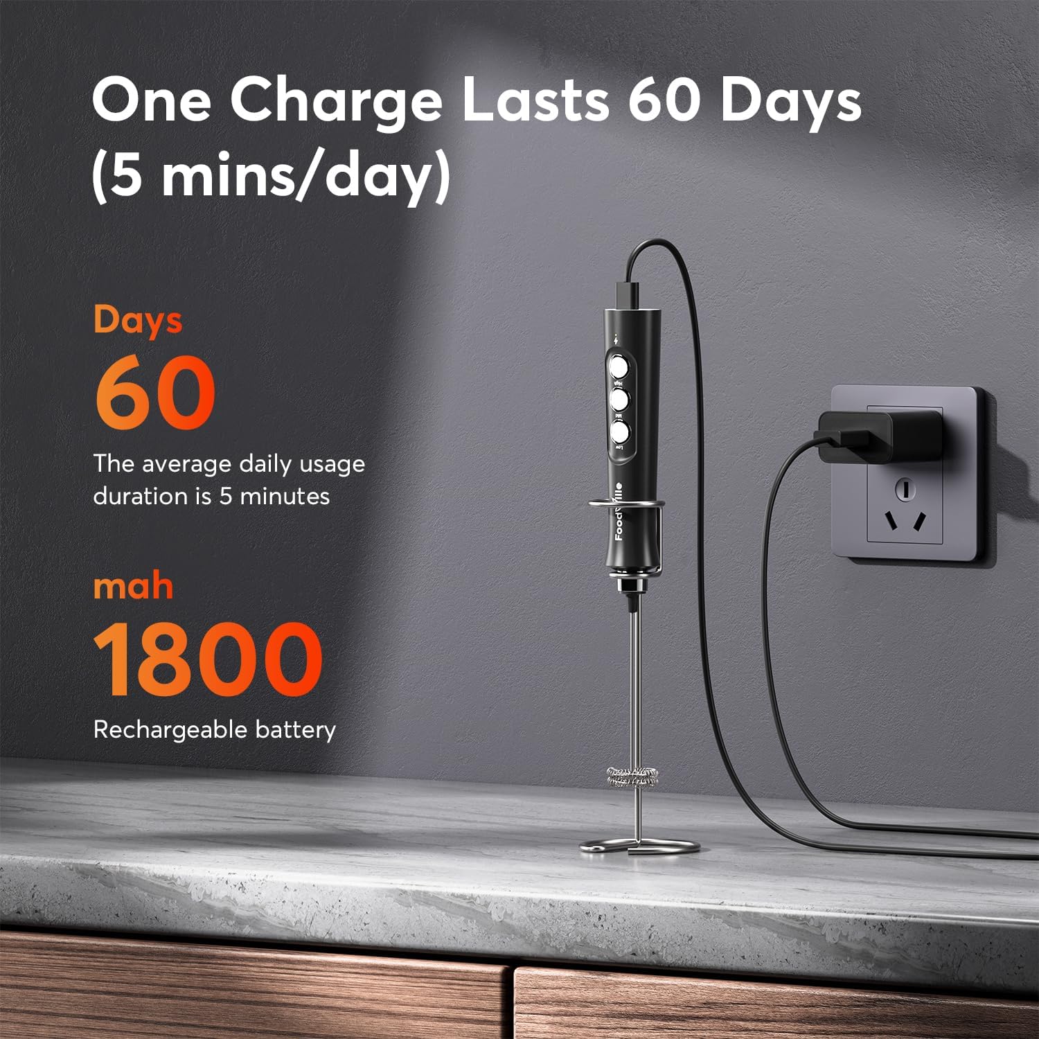 Ultra-Portable & Extreme Convenient: The frothing wand is powered by built-in rechargeable battery, letting you charge anywhere without hassle battery replacement. Turn the wand upside down on the countertop, you can concentrate on other kitchen operations.