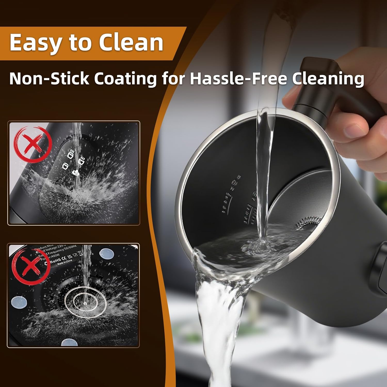 4-in-1 Multifunctional Design: With one button, this milk frother can heat milk, create smooth hot foam, cold foam, or prepare hot chocolate. Whether you’re new to coffee or a home barista, enjoy café-style drinks anytime.. Large 11.8oz Capacity: Heats up to 11.8 oz (350 ml) or froths up to 5.6 oz (160 ml) of milk. Designed for both heating and frothing, and blocks spills when milk stays below the max fill line.. Fast and Precise Heating: Warms milk to 140°F-149°F in just 2–3 minutes. The ideal temperature helps preserve flavor and achieve a rich, velvety texture for your coffee drinks….