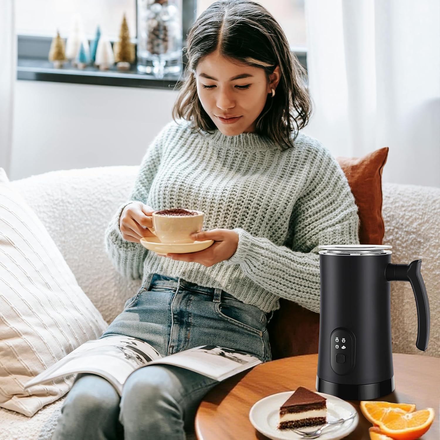 4-in-1 Multifunctional Design: With one button, this milk frother can heat milk, create smooth hot foam, cold foam, or prepare hot chocolate. Whether you’re new to coffee or a home barista, enjoy café-style drinks anytime.