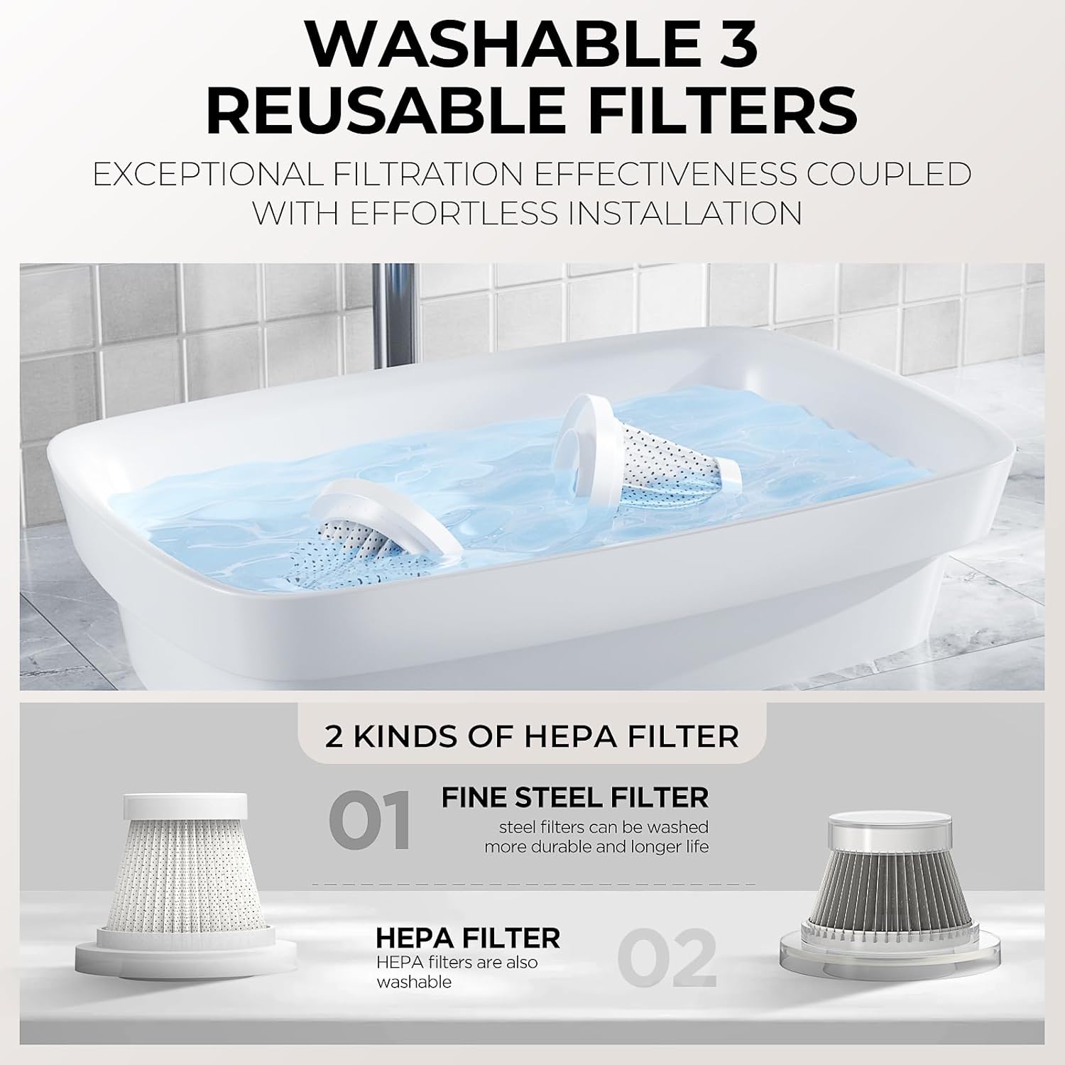 - 【WASHABLE】Additionally, its reusable HEPA filters are washable and air-dried, while two de-tangling brushes swiftly remove hair,with extra 2 HEPA filters,ensuring lasting functionality.The HEPA filter captures a whopping 95.99% of dust and particles