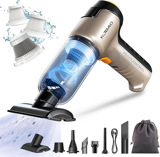 - 【PORTABLE, COMPACT & WASHABLE】KJBAO mini cordless vacuum for car boasts a compact, handheld design weighing merely 0.83lbs. Its allows effortless maneuverability around the house and car with one hand, making cleaning a breeze. Store it conveniently in the trunk or closet for quick access