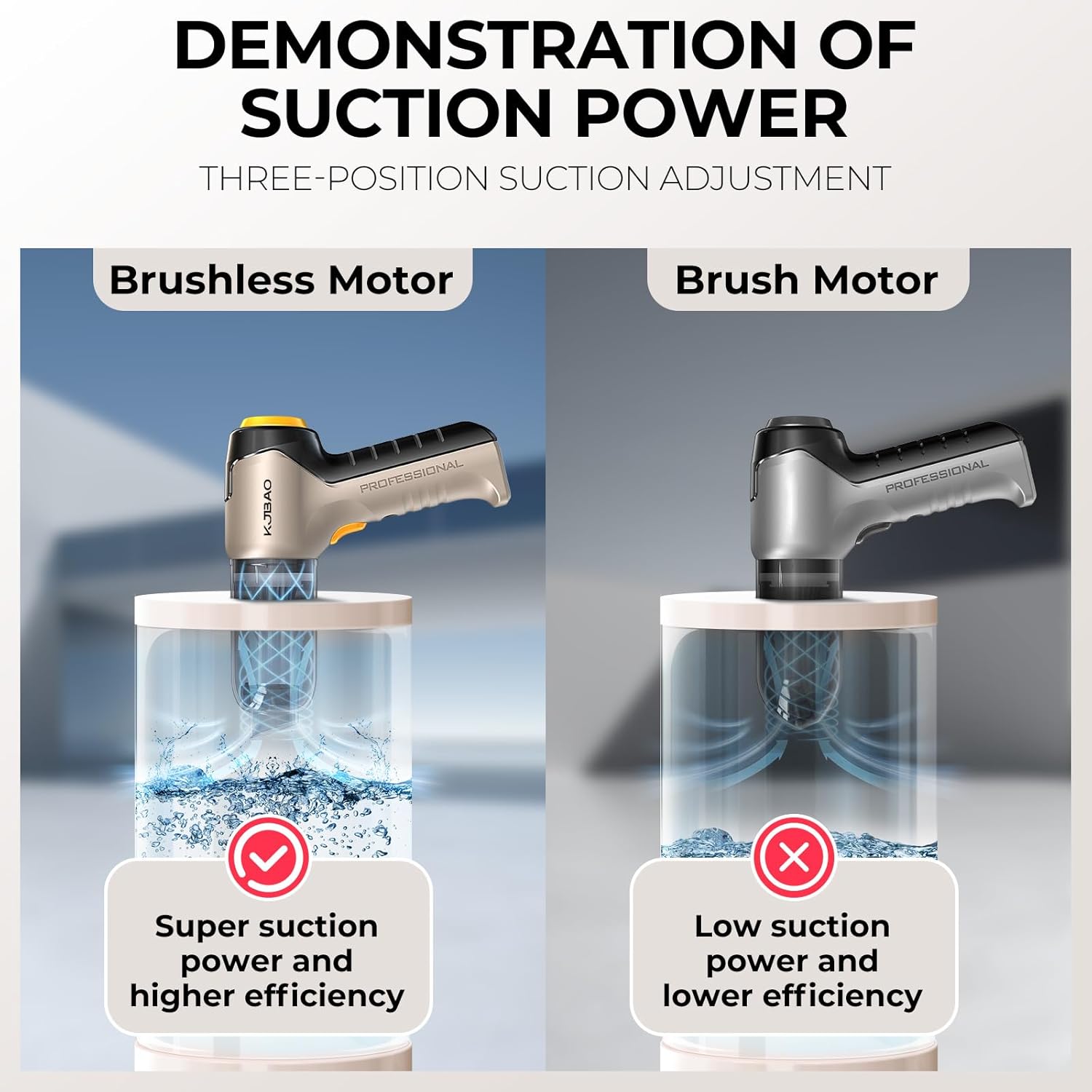 - 【9000PA OR 15000PA SUCTION CAR VACUUM】KJBAO car vacuum cleaner boasts an 80000rpm brushless motor provides suction of Max 45AW/15kPa. With 3-gear adjustable suction modes: generating great suction of 9000PA ,12000PA,15000PA respectively, it’s tailored for car interiors, effectively tackling stubborn sand,dirt, dust, and debris. Eco Mode can be used for 30 minutes, and Max Mode for 12 minutes