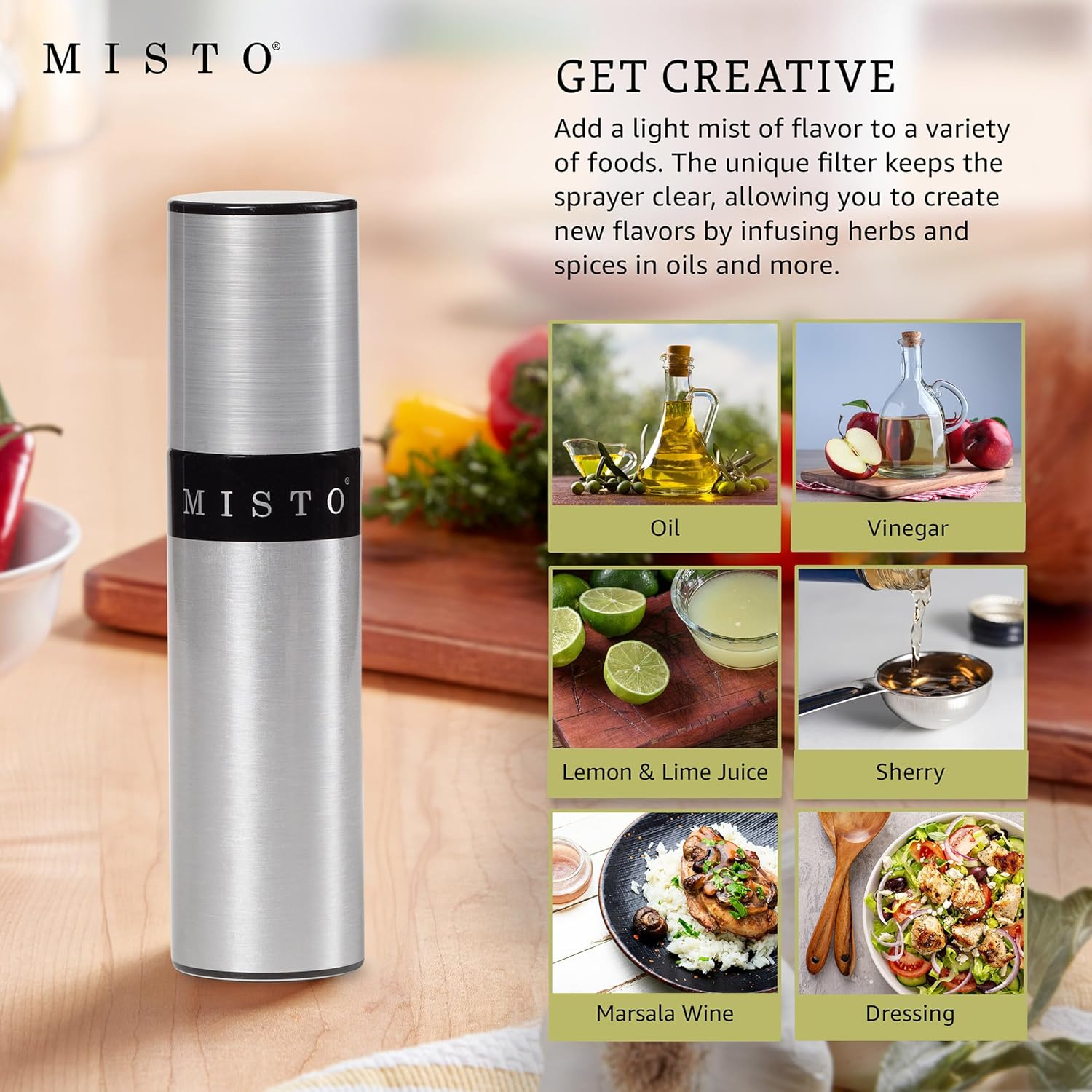 - UNIQUE FILTER: allows you to infuse oil with herbs and other spices without clogging the sprayer