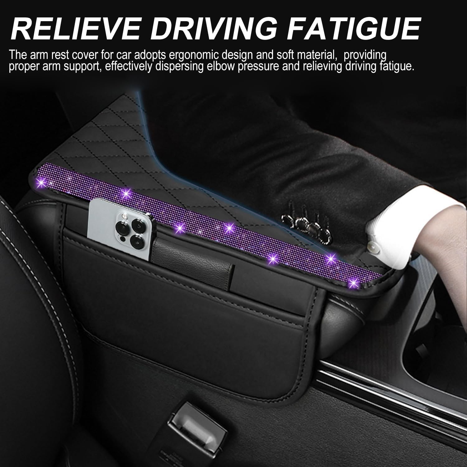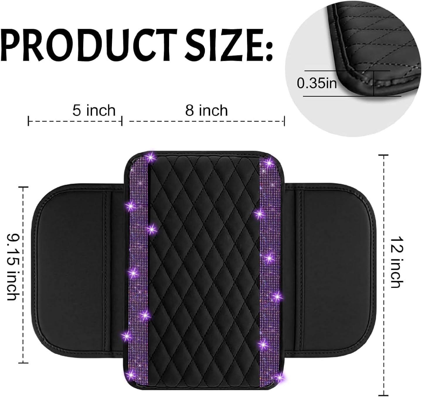 Convenient Storage Design: This car console cover measures 12.13 x 7.8 inches, with an 8.66 x 5.12 inch pocket on each side. These pockets are perfect for storing small items such as your phone, keys, or sunglasses, keeping your car interior organized and your essentials within easy reach.. High-quality Material: Crafted from high-quality leather, the surface of this armrest box cover is inlaid with diamonds, giving it a gorgeous and exquisite look, adding a sense of luxury and fashion to the monotonous environment of the car. Inside, it is filled with memory foam, which not only provides a soft and comfortable touch but also can slowly recover to its original shape after squeezing.. Relieve Driving Fatigue: The arm rest cover for car adopts ergonomic design, giving just the right amount of arm support, effectively dispersing elbow pressure and relieving driving fatigue. Additionally, it effectively protects the center console from scratches, spills, and daily wear and tear, maintaining the interior’s pristine condition….