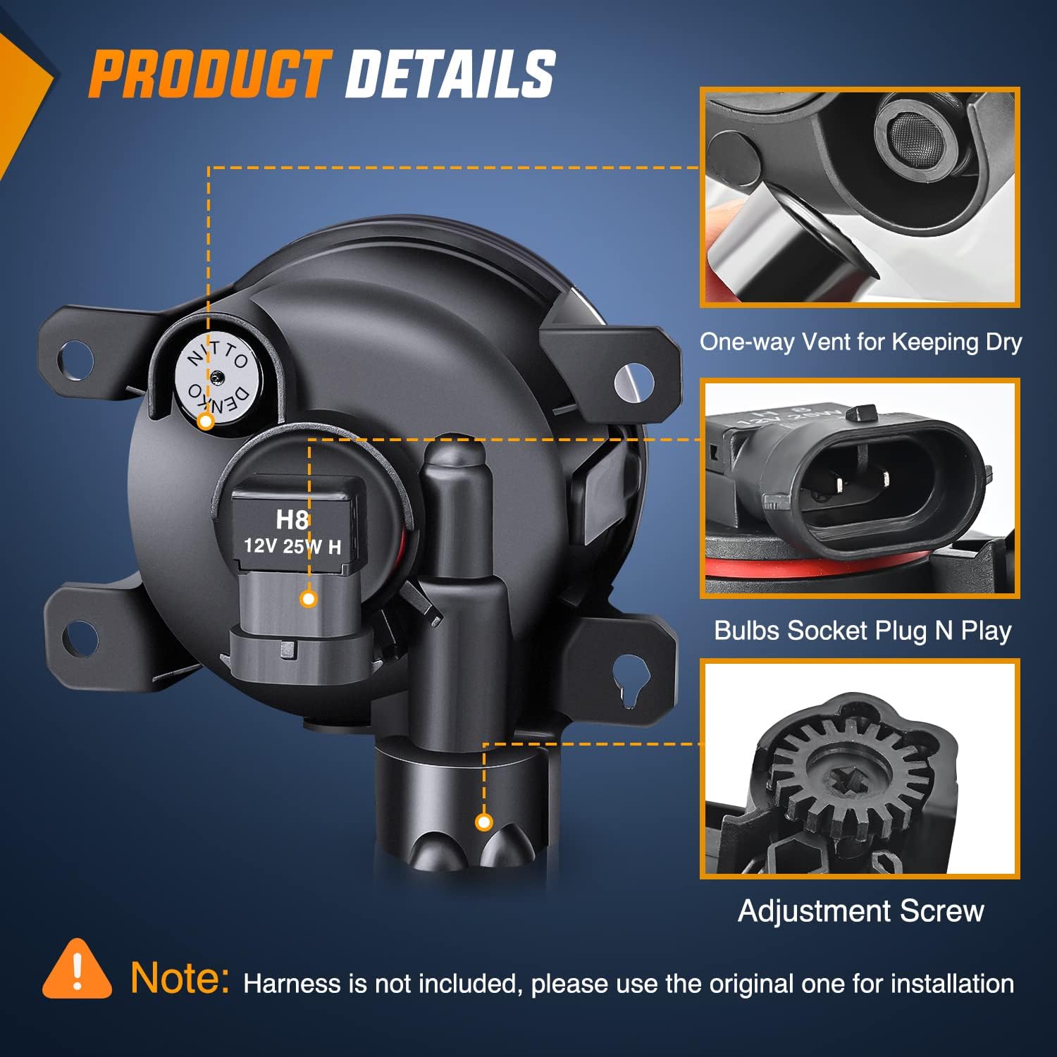 - Packages: Comes with a pair of fog lights (driver’s side and passenger’s side), H8 bulbs, silica gel desiccant. Professional installation is highly recommended.