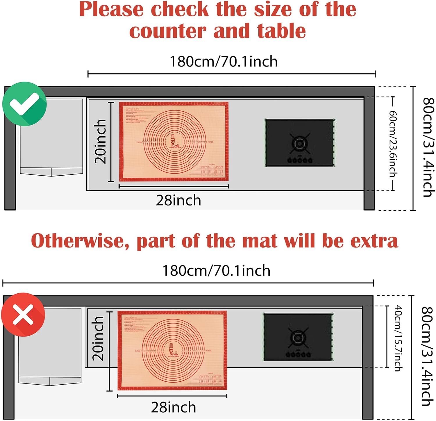 Nonslip back side and Multifunction:We upgraded the back non-slip design.It will stay good on the table when rolling dough.It is good for Pastry Mat(20×28 inches),Table Mat,Baking Mat (Temperatures from -30°F to 470°F ),Pizza Pad and Countertop Mat.