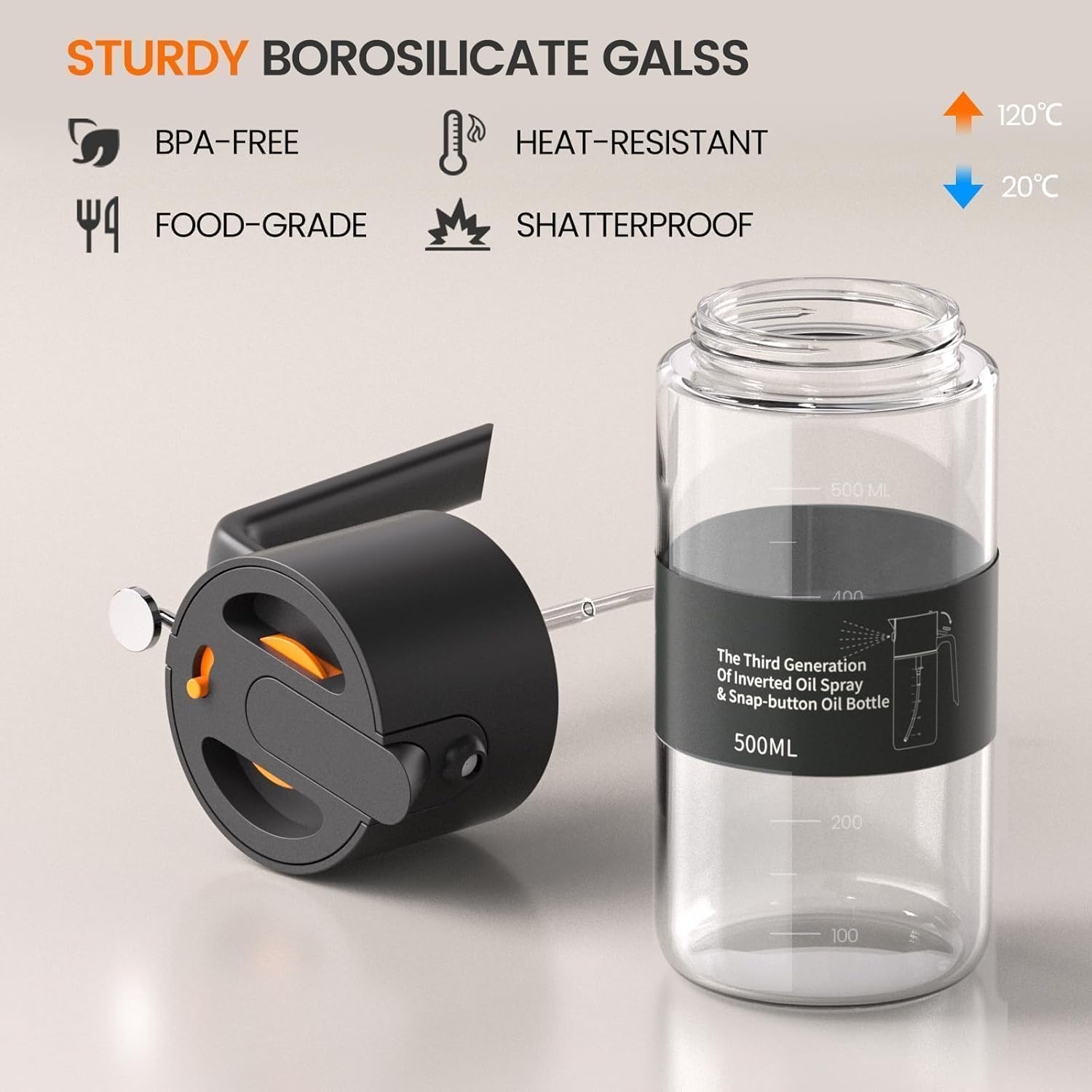 New-Generation Multifunctional Design: ONE Quick-FAST press for ultra-fine spray, ONE Gentle-SLOW press for a straight stream, or pour the oil directly, three ways to help enjoy adding flavor and depth to dishes for various culinary applications. Upgraded Patent Spray Design: Market-Only,our advanced atomizing nozzle makes it to dispense precise CIRCLE fine mist spray about 0.5g(0.02oz), achieve EVEN coverage on cooking surface with calorie-controlled spray,no need to move when spraying, and never worry about oil leaking thanks to the special anti-leak recycle nozzle design. Versatile Useage: Designed for use with various cooking liquids such as oils (olive, avocado, canola), sauces (soy sauce, wine) and more daily cooking oil in home and kitchen…