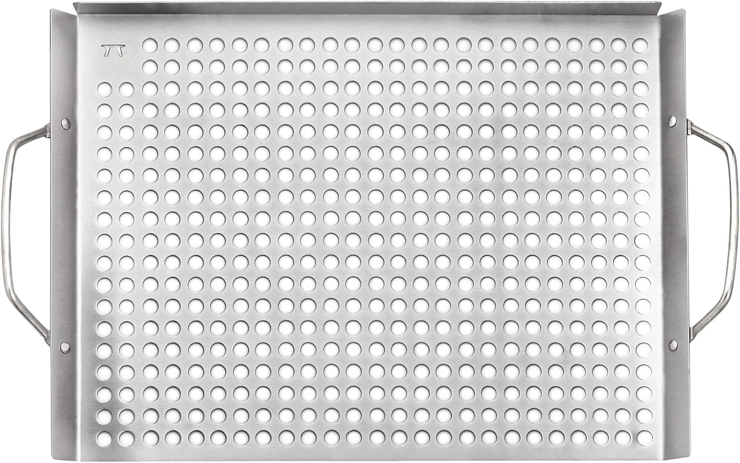 GRILL MEAT AND VEGETABLES on this large stainless steel grill topper, designed for delicate food and small pieces that would fall through the grill grate: shish kabobs, onions, broccoli, asparagus, potatoes, fish. STAINLESS STEEL 430 design brings a modern look and long-lasting durability to the grill; Perforated grill pan with holes allows even airflow over and under food, while any drippings drain into grill’s grease drip tray. EASY TO USE Grilling tray for outdoor grill features side handles for easy lifting and raised edges to help flip food; When handling hot grill tray, prevent burns with an Outset grill mitt or grill glove!…
