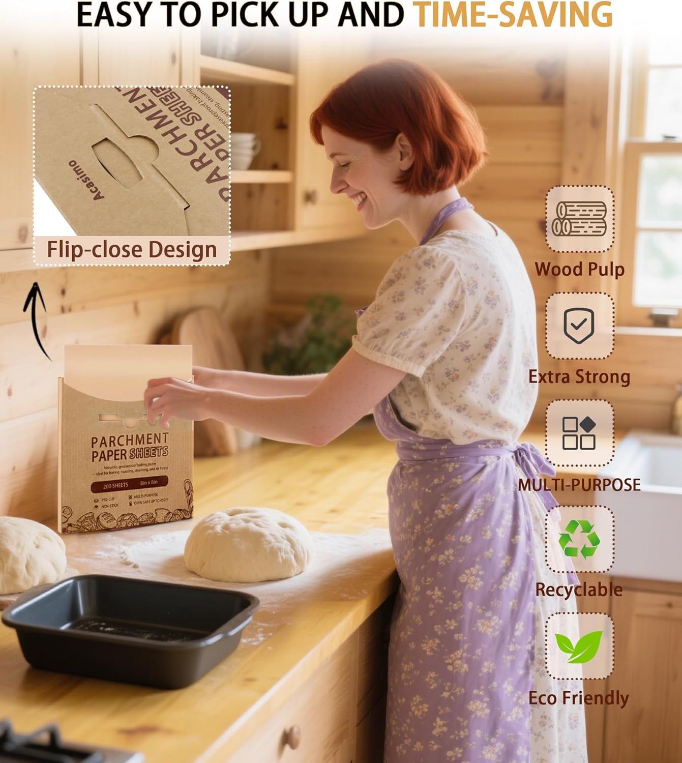 PRE-CUT FOR EASY USE: Square parchment paper sheets contains 200 sheets per box, the baking sheets are pre-cut to 8*8 inches to fit your baking sheets and lay flat, no need to measure and cut, saving you time and effort. the opening of the paper loaf pans for baking box makes it easy to access, while the compact size saves you space