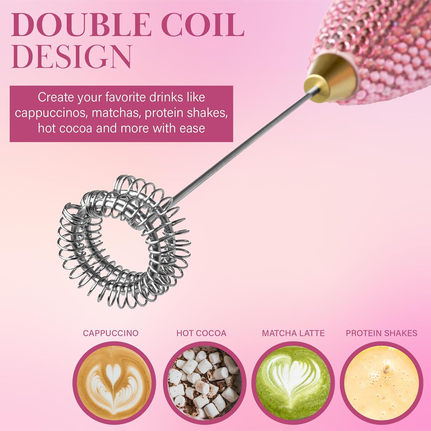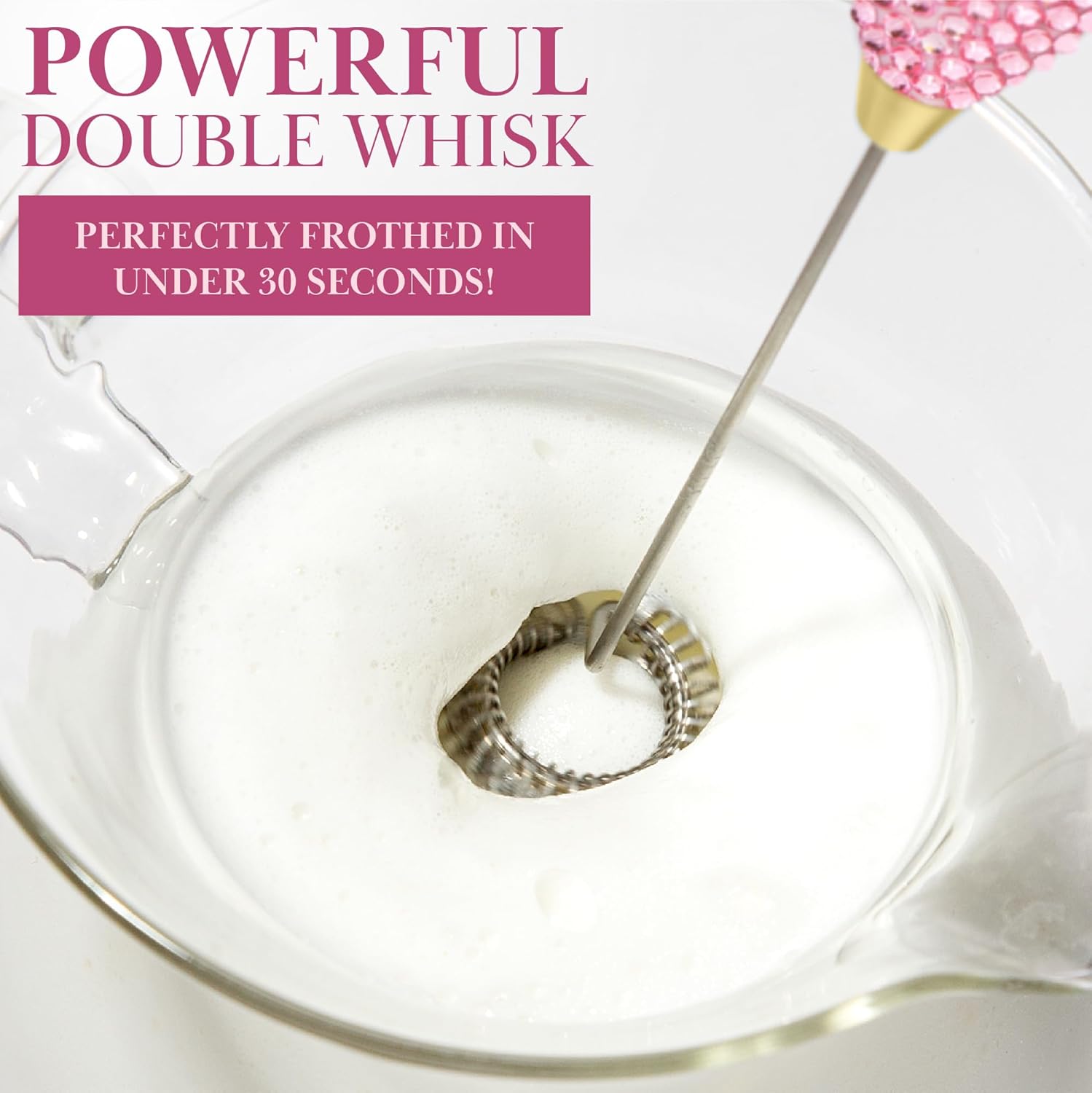 DOUBLE COIL POWER: Perfectly froth your milk for cappuccinos, matcha lattes, protein shakes, and more in under 30 seconds with the iconic double coil whisk.. CONVENIENT & PORTABLE: Battery-operated for easy use anytime, anywhere. Designed with a simple on/off button for effortless operation. Requires 2 AA batteries, not included.. SHINE ON: Featuring over 1,200 pink rhinestones, this milk frother is an epic countertop statement….