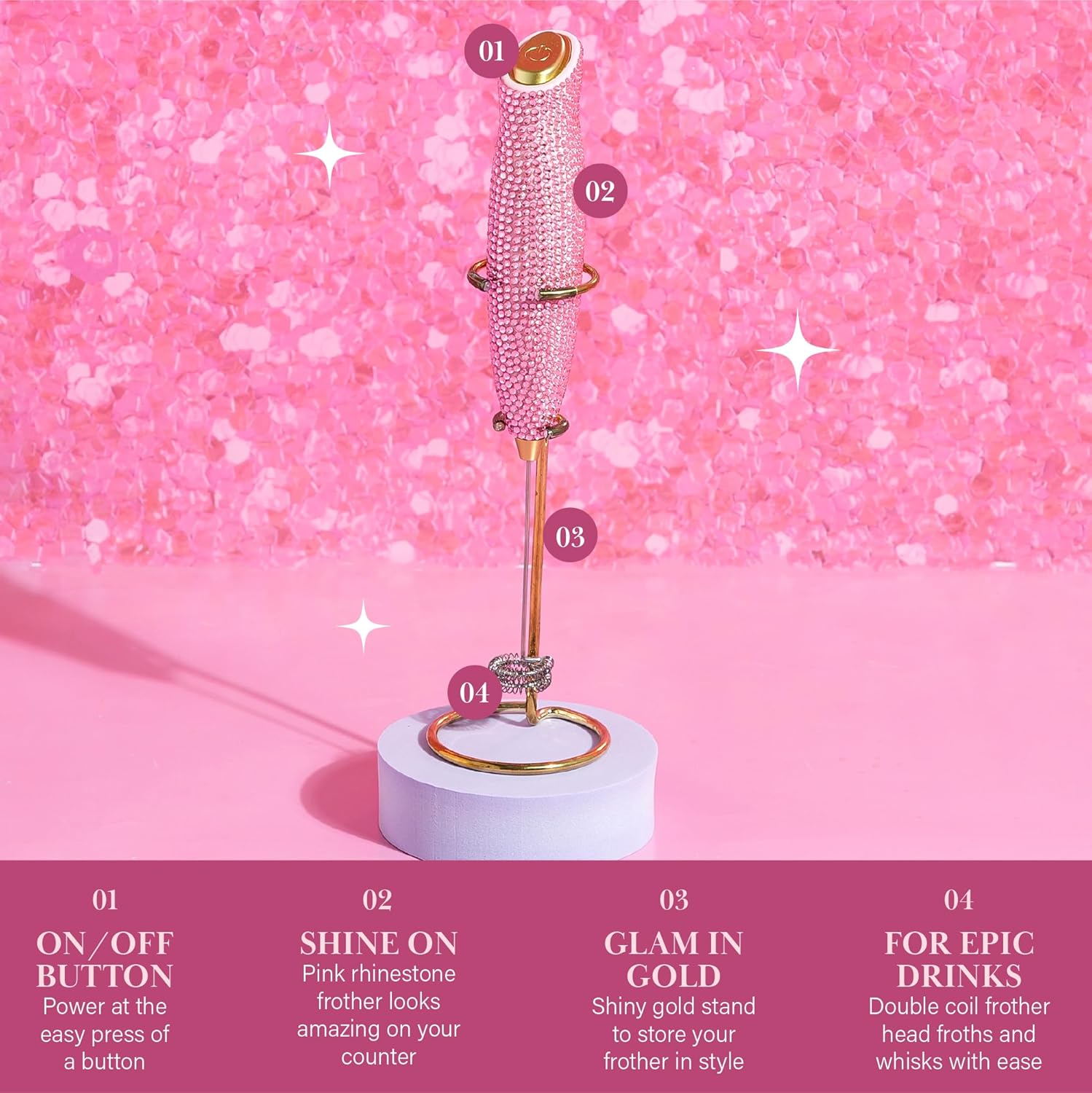 - SHINE ON: Featuring over 1,200 pink rhinestones, this milk frother is an epic countertop statement.