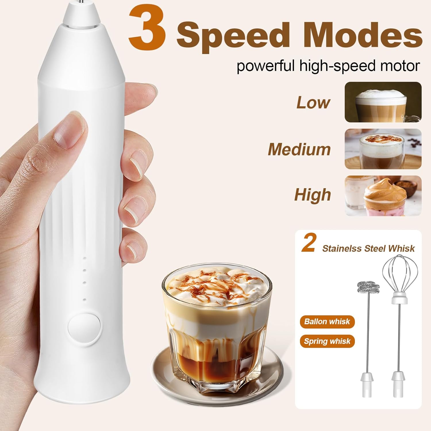 【USB-C Fast Charging】Skip frequent battery changes—USB-C fast charging (included cable) fully powers up in 3 hours .red light on when charging, off when done. Enjoy wireless, eco-friendly frothing anytime, anywhere with this hand mixer electric handheld.. 【Silky Milk Foam】With its premium stable motor & dual-spring design, this hand frother whips up smooth, rich foam in 15 seconds. 3 speed settings (High/Medium/Low) customize texture—ideal for coffee lovers.. 【One-Button Operation】A single button controls power, speed, and shutdown—no complex settings,Tap repeatedly to change speed. After 3s, tap again to turn off. It works perfectly with matcha, lattes, milkshakes, almond milk, eggs, and pastry batter. (To avoid splashing, please do not overfill and ensure your cup or pitcher is tall enough.)…