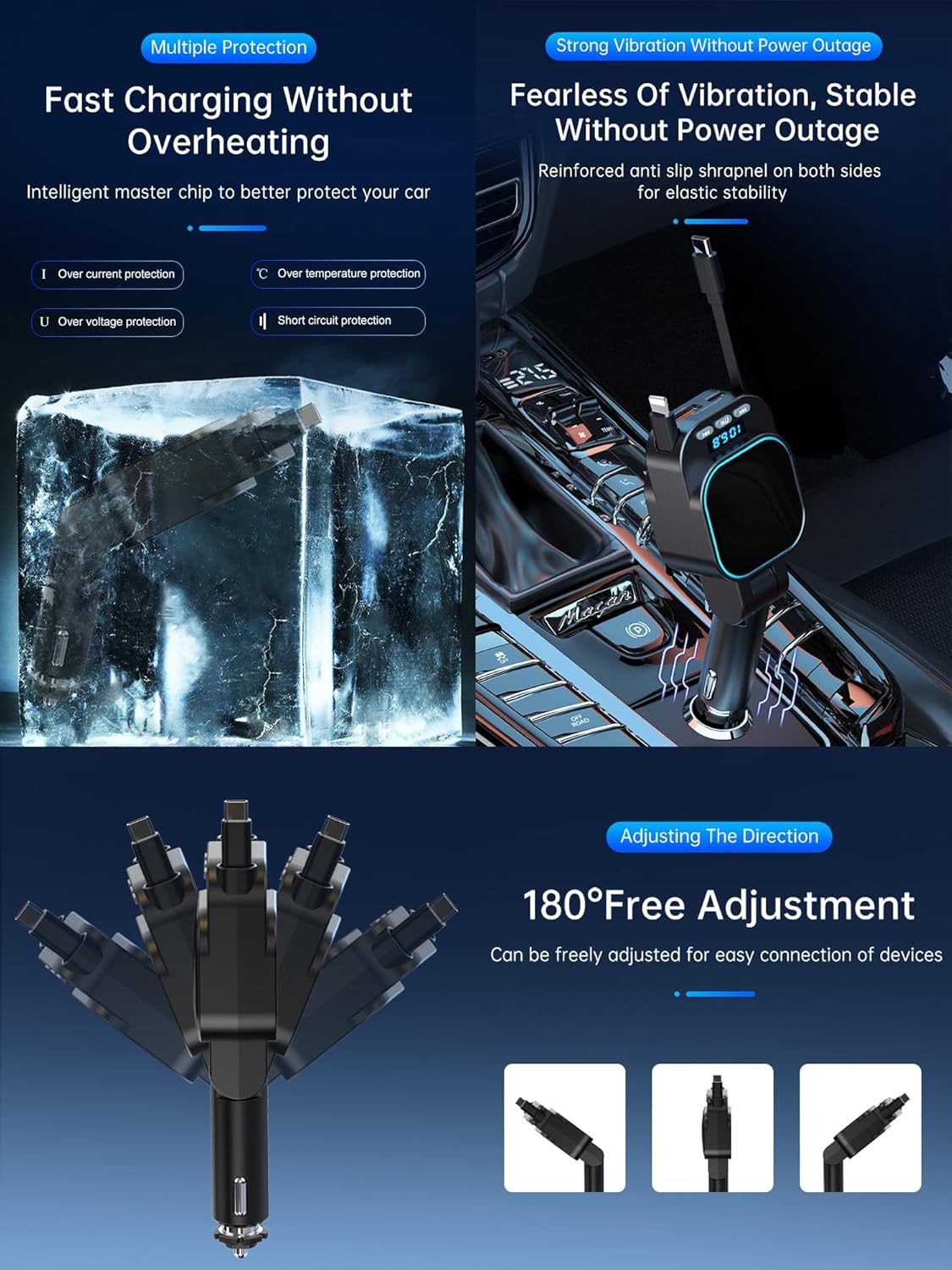 â…¥: Comprehensive Compatibility: The 4 in 1 Retractable car charger is compatible with the iPhone 16/15/14/13/12 series, making it a versatile choice for iPhone users. Whether you’re looking for a car charger for iPhone 16 Pro Max, iPhone 16 Plus, or earlier iPhone models, this device offers flexible fast charging options. It also supports USB C and USB A devices, ensuring all your gadgets are covered, whether you’re outfitting your truck accessories or looking for unique gifts for car lovers.