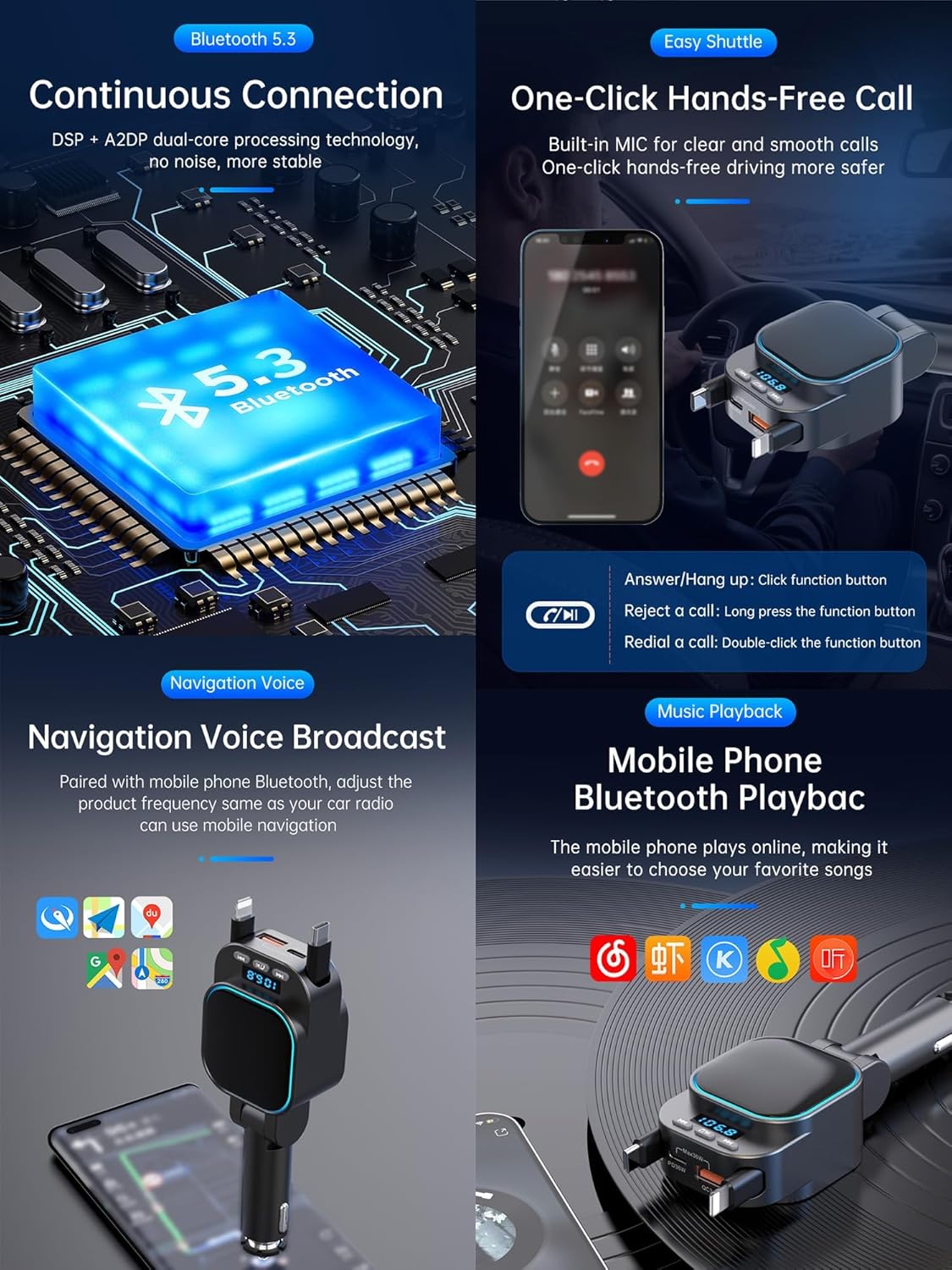 â… : The Ultimate Multi Device Charging Car Organization : Car Charger USB C with Bluetooth Car Adapter- The 4 in 1 Retractable Car Charger with dual USB ports and versatile cable provides complete charging solutions. Perfect as truck accessories for men or gifts for drivers, this USB C Car Charger ensures fast charging for iPhone 16 Pro Max and Android devices. Keep your Car Charger-powered vehicle clutter free with smart organization.. â…¡: 96W Retractable USBC Car Charger : Car Charger USB C delivers 96W power through PD USB-C/USB-A/Lightning ports. Ideal for RAM truck accessories or women’s car accessories, the USBC Car Charger maintains full-speed charging for four devices simultaneously. Experience USB C Car Charger efficiency across all vehicle types.. â…¢: Upgraded Bluetooth 5.3 Technology: With the latest Bluetooth 5.3 technology, car adapter Bluetooth achieves faster pairing, lower latency transmission, and a more stable connection with less sound loss, offering you an uninterrupted calling and music playing experience. This Bluetooth 5.3 fm transmitter for car is designed to remember your last-connected device without the hassle of reconnecting the device everytime….