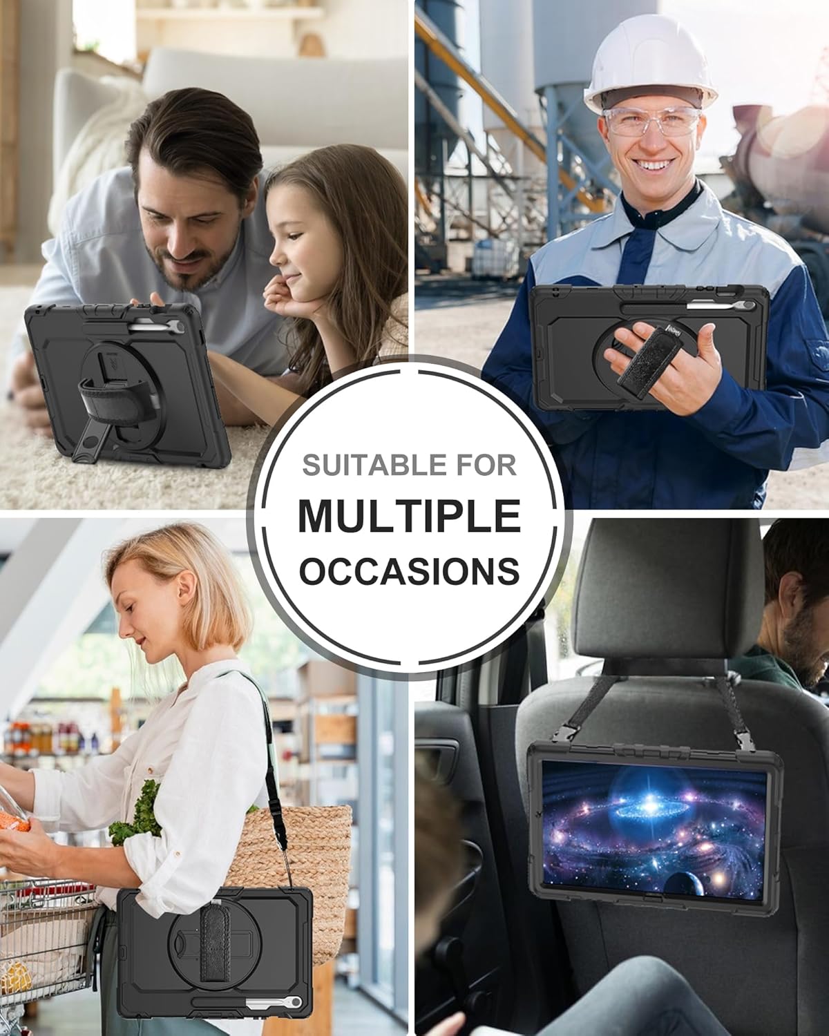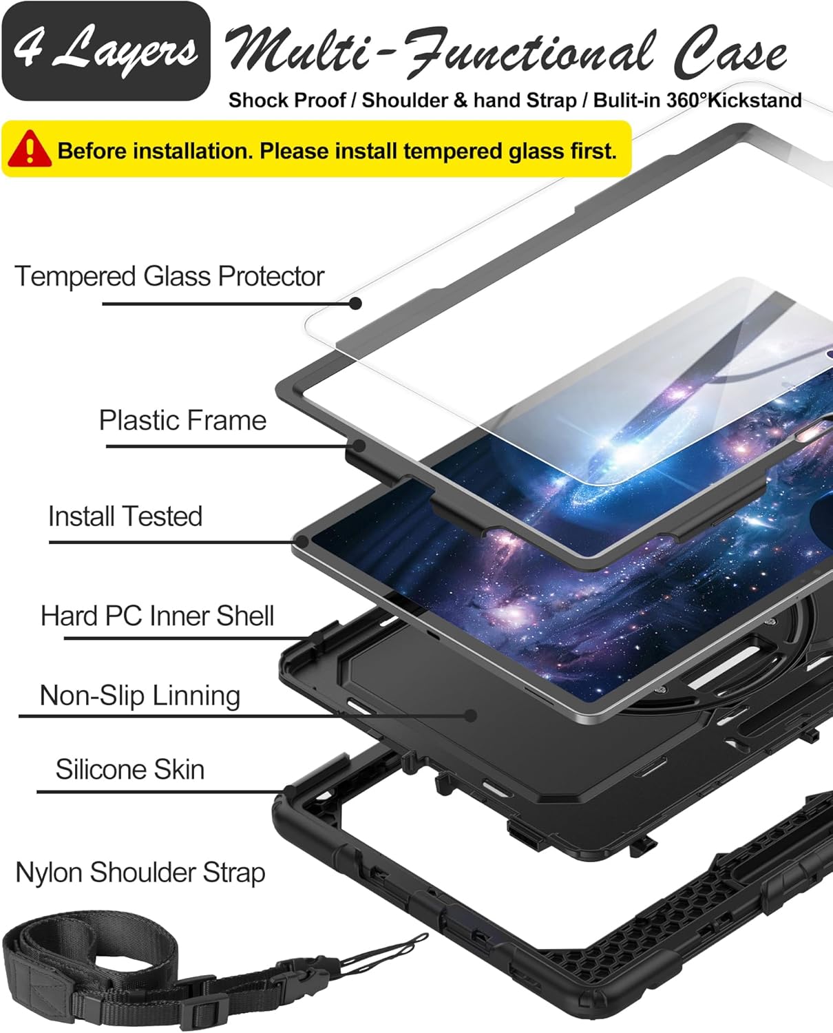 The **S10 Case for Samsung Galaxy Tab S10 FE Plus 5G Tablet 13.1” Shockproof Protective Cover with Tempered Glass Screen Protector Rotatable Kickstand S Pen Holder Hand/Shoulder Strap Black** is a premium tablet case engineered for comprehensive protection and enhanced user experience. It features: Tempered Glass Screen Protector, resistant, fingerprint, proof, sensitive to touch, easy to install and durable, and can be used perfectly with Stylus S.