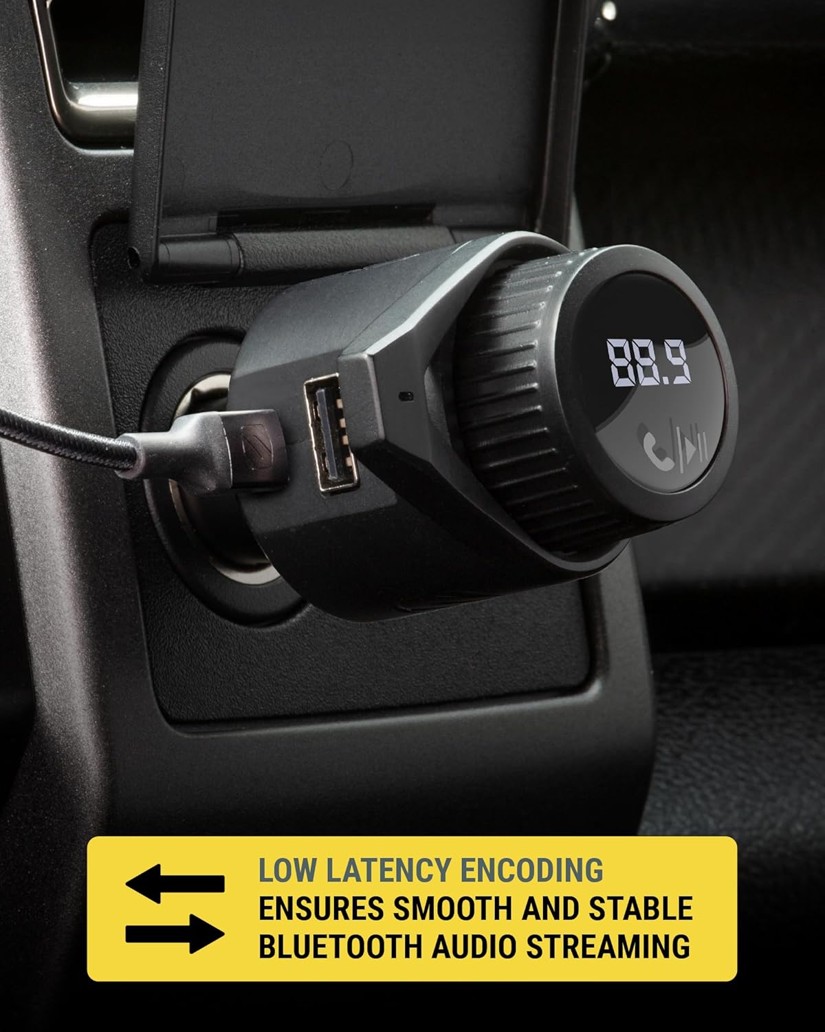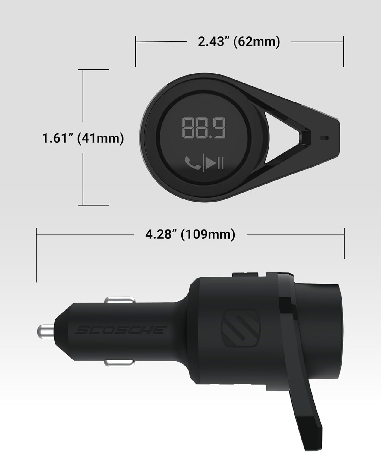 Car FM Transmitter – Experience superior sound quality and seamless connectivity with our Bluetooth FM Transmitter for Car. Effortlessly connecting to your car’s FM radio, the Bluetooth car adapter enables wireless music streaming from your device via Bluetooth. It’s the perfect solution to integrate Bluetooth for cars without Bluetooth.. Hands-Free Car Kit – Make and receive calls effortlessly while driving with the Scosche Handsfree Bluetooth Car Kit. This Bluetooth car adapter makes it possible to connect your smartphone to your car stereo through the Bluetooth transmitter, allowing you to keep your hands on the wheel and eyes on the road.. 12V Cigarette Lighter Adapter – Plugs directly into your car’s 12V cigarette lighter socket for unlimited transmitting and listening hours. This FM Bluetooth Transmitter car adapter doubles as a cigarette lighter charger and features dual USB-A and USB-C 12W charging ports, allowing you to charge multiple devices on the go….