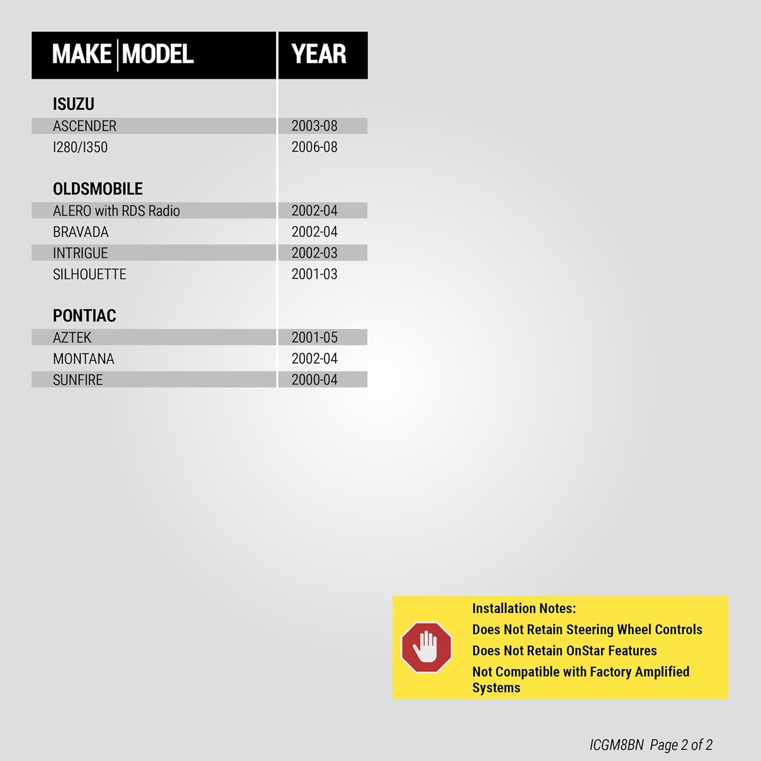- Perfect Fit: Designed for select Non-Amplified 2000-12 GM vehicles, the ICGM8BN basic radio dash install kit ensures a seamless fit for your new aftermarket Double DIN car stereo. Does Not Retain Steering Wheel Controls. See guide image for vehicle list