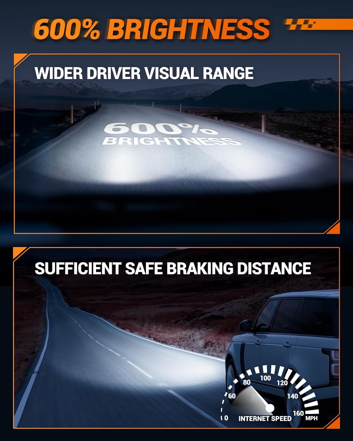 12000LM Super Bright: Delivers up to 12,000 lumens of brightness with a 6500K cool white color, 600% brighter than standard bulbs—perfect for rainy, foggy, or snowy conditions