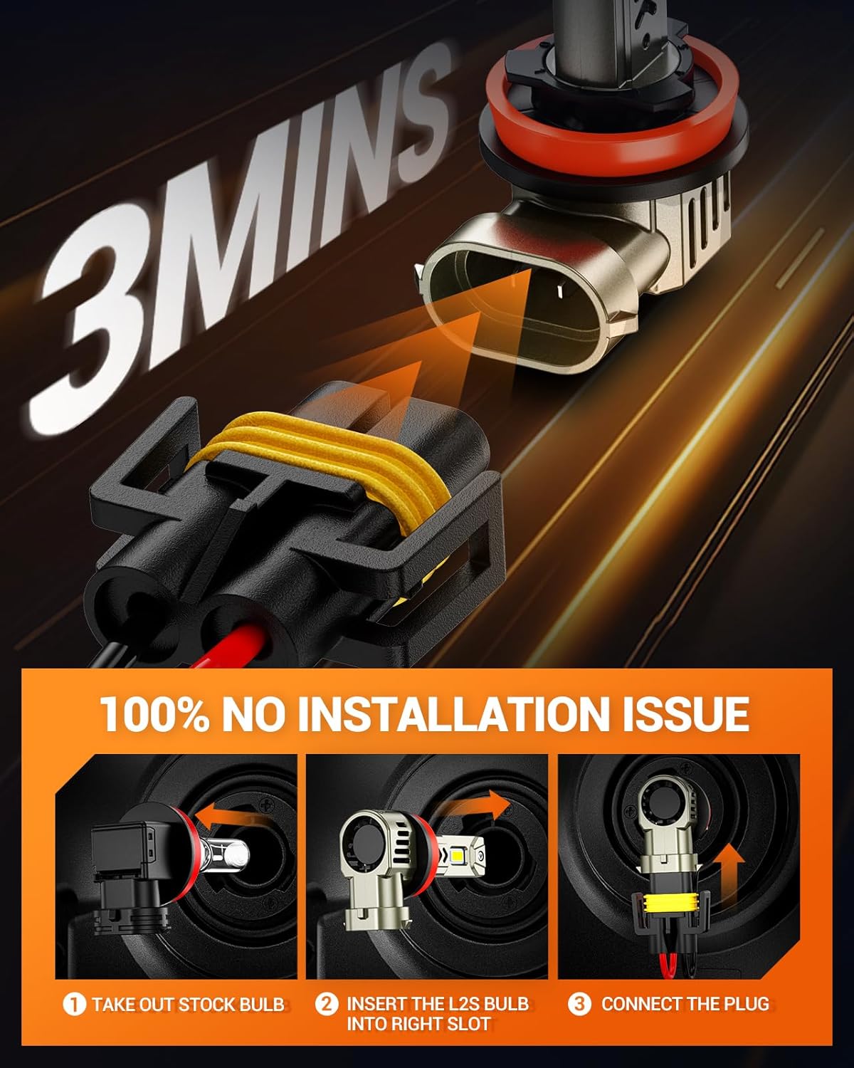 Real 1:1 Size L2S H11 bulbs fit seamlessly, replicating your originals. 360° adjustable lock ring for effortless, 3-min installation. Enhance your H11/H9/H8 driving lights instantly, no hassle, just brighter roads ahead