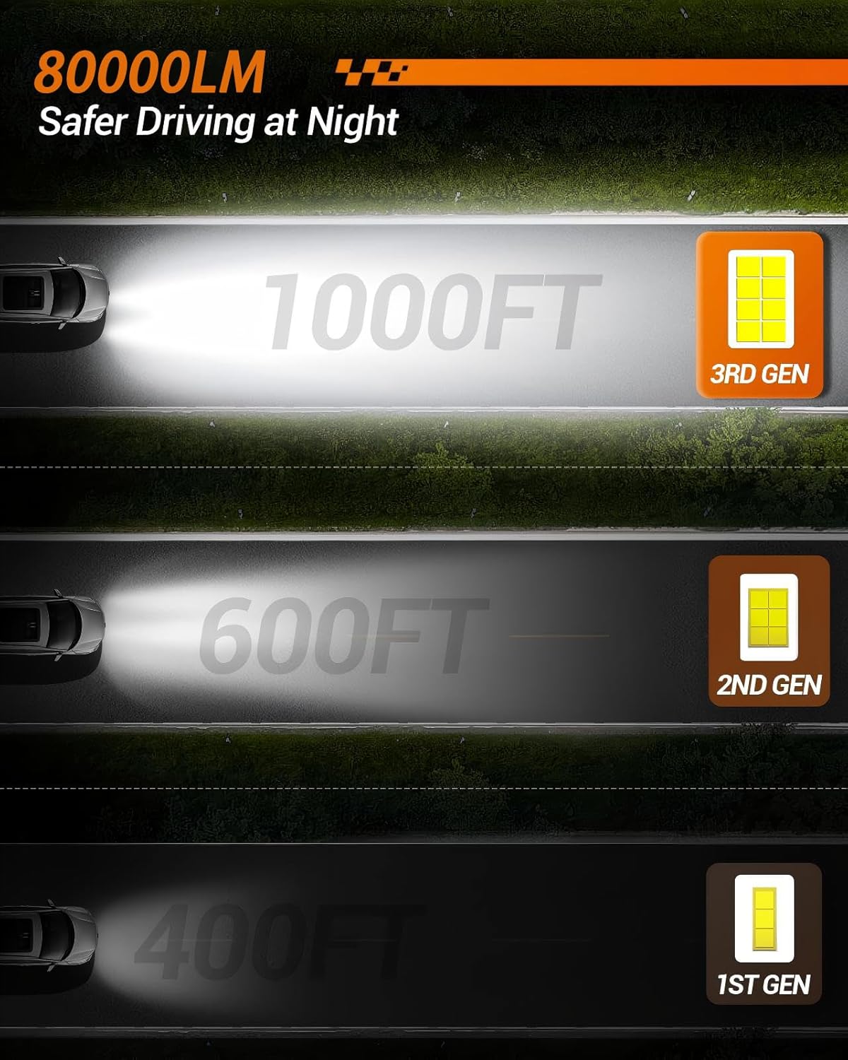 【80,000LM Super Brightness】 SEALIGHT S2S 9005/HB3 9006/HB4 lamps ensure up to 1500FT visibility through advanced CSP chip technology, delivering 100,000LM ultra-focused illumination paired with a 6500K crisp white that enhances road clarity and safety in low-light conditions.