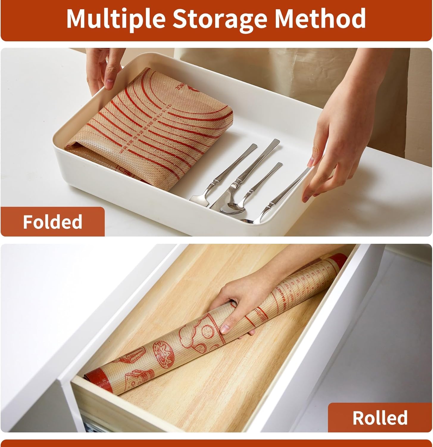 Easy to Clean & Store:Even burnt sugar and fat falls off on its on, you can dump the crumbs in the trash in a snap. Just rinse the silicone baking mat in warm soapy water to clean it or air drying will be enough. It is also microwave and dishwasher safe. After the mat is dried, simply fold or roll it up and easy to store