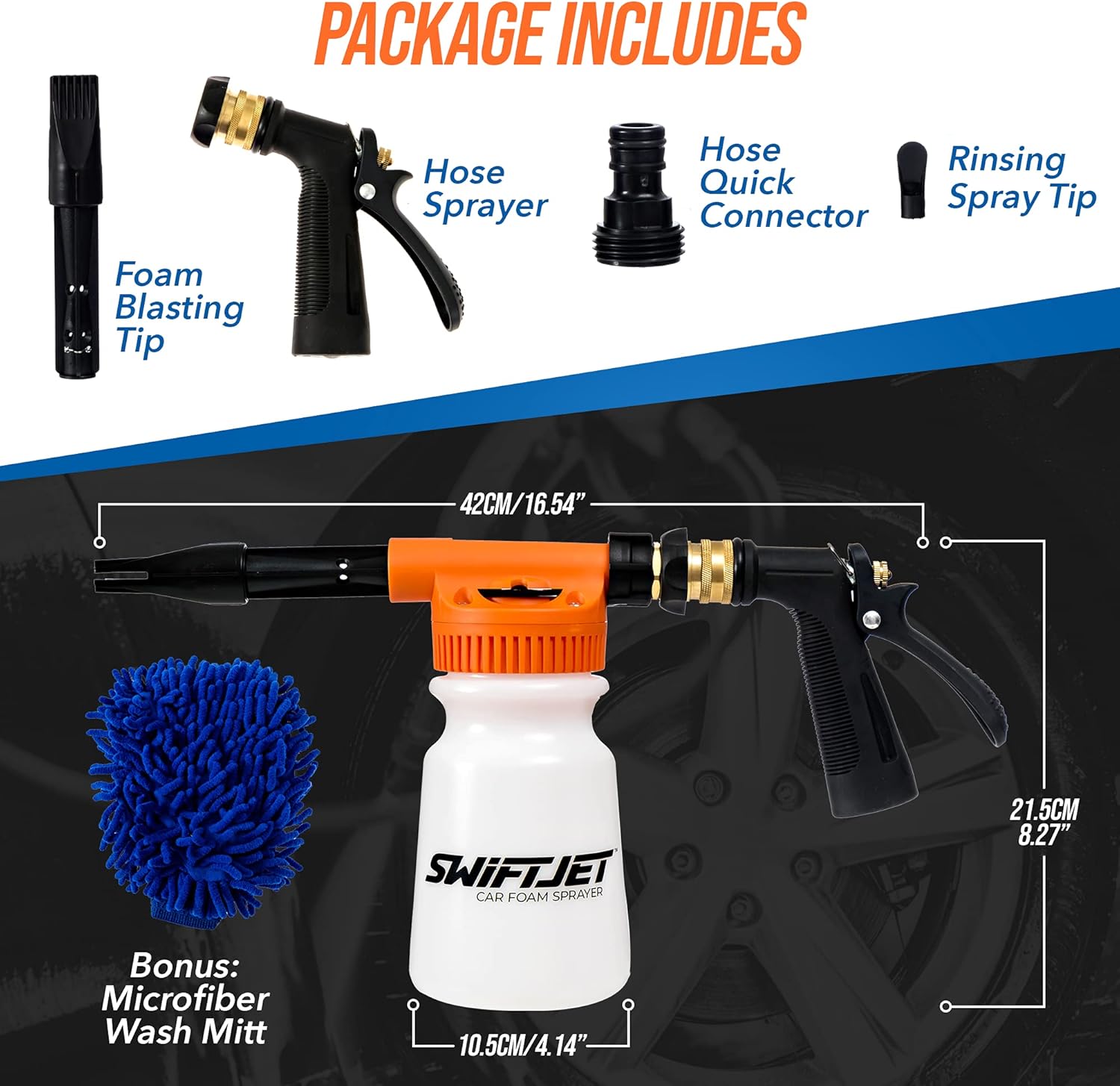 Swiftjet Car Wash Foam Gun + Microfiber Wash Mitt – Foam Cannon Works With Any Soap – Garden Hose Car Foam Sprayer – Car Wash Kit – Car Accessories Foam Blaster (Orange Foam Gun With Mitt)