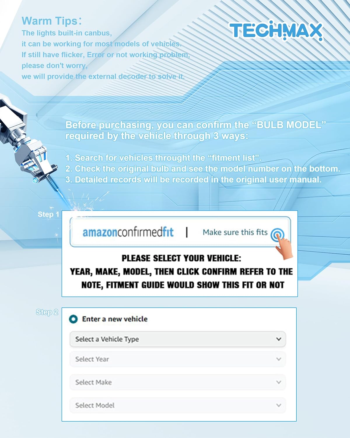 99.9% compatibility:TECHMAX H7 light bulbs are compatible with 99.9% of vehicle computer systems without error, flicker or does not work, If you encounter any errors with sensitive vehicles, we will use a decoder to solve the problem or provide the solution for you.