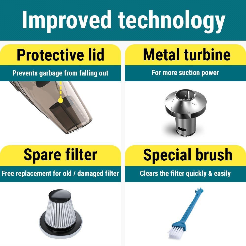Practical: A mini vacuum for car or truck that is compact, lightweight (2.4 lbs), and easy to use. The large dust bin capacity is ready for ash, dust, or drive-thru food spills. A fully loaded interior car detailing kit housed in an ergonomic design.. Effective: Made for on-the-go use and to solve out-of-reach problems. A very sandy day at the beach? A coat of dog hair? The portable vacuum cleaner for car is designed to solve problems.. Powerful: The cyclonic force and strong suction of the 106w motor will terminate any dirt or debris; say goodbye to hard-to-reach crumbs stuck under the driver’s seat. Our mini car vacuum even has a top of the line washable HEPA filter….
