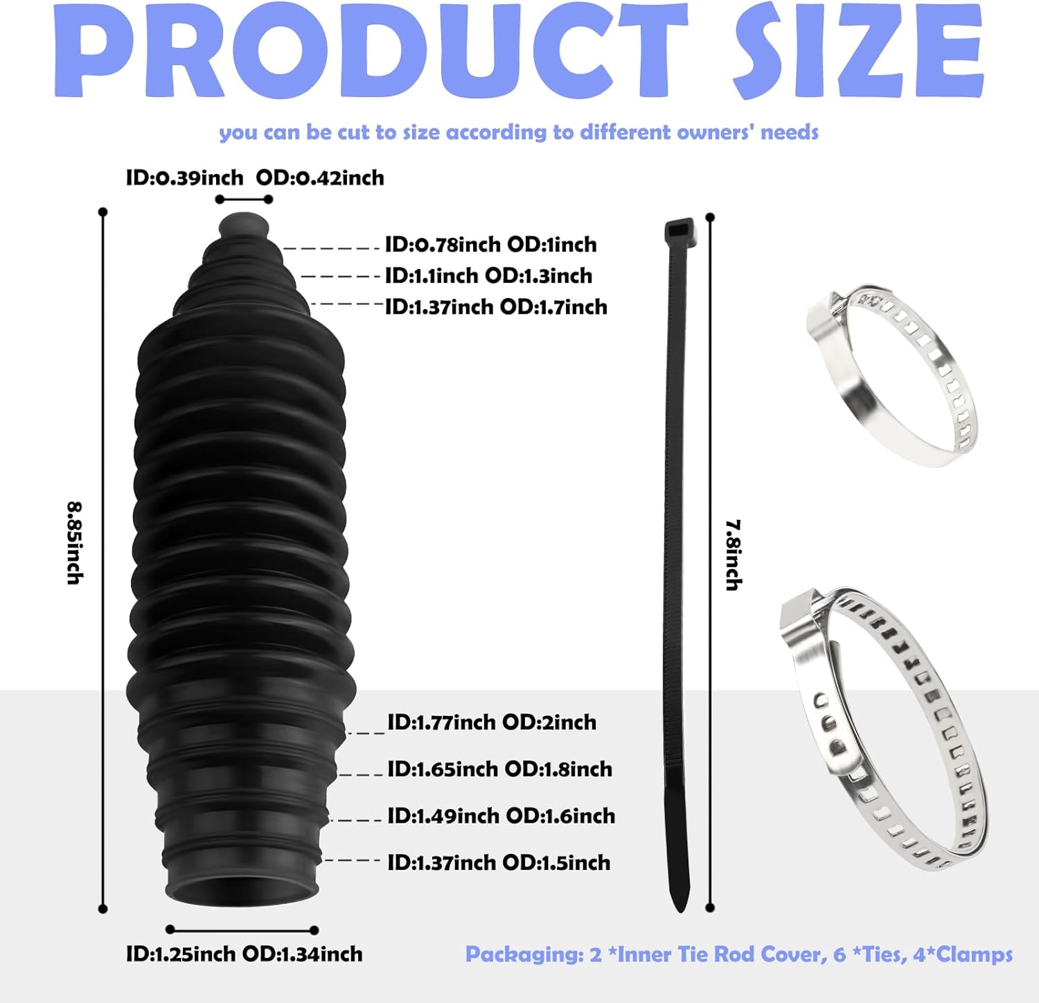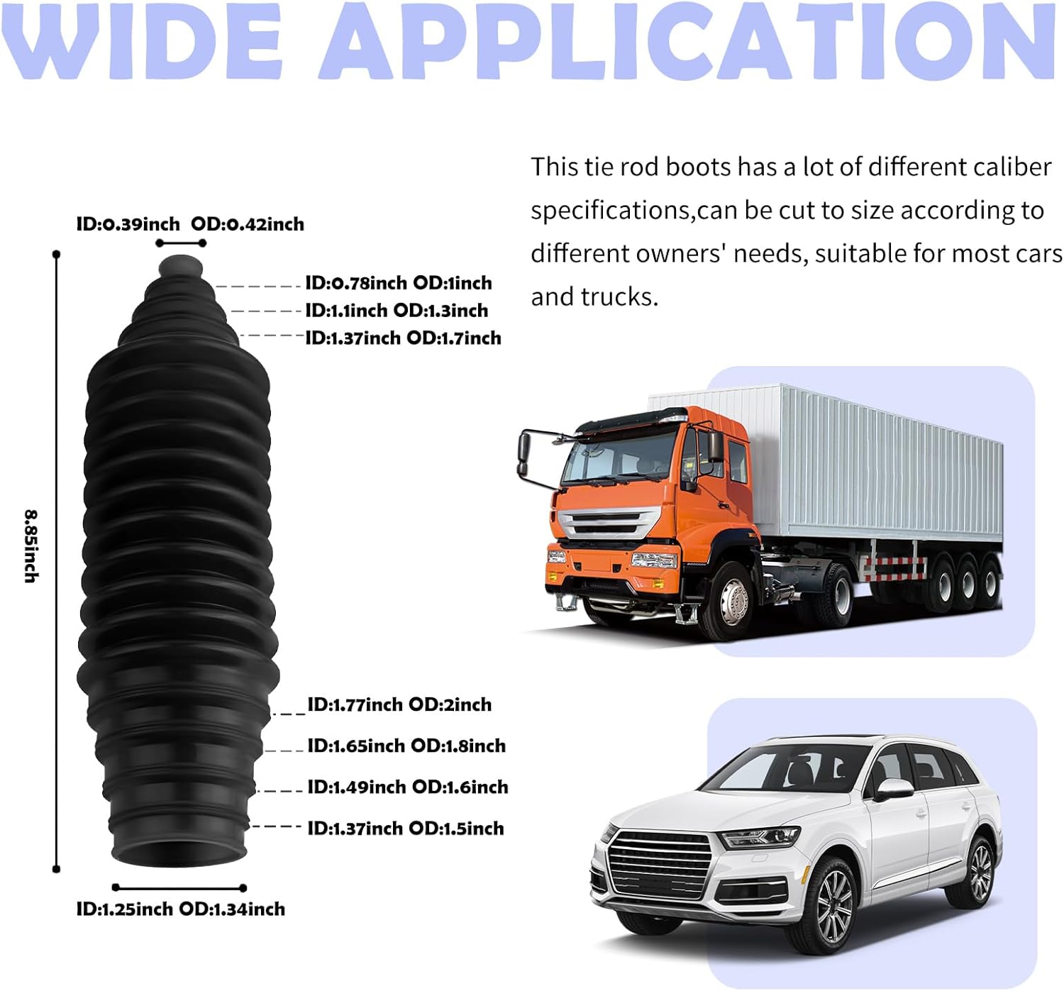- Wide Application: This tie rod boots has a lot of different caliber specifications, including inner diameter: 0.39″ 0.78″ 1.1″ 1.37″ 1.25″ 1.49″ 1.65″ 1.77″, can be cut to size according to different owners’ needs, suitable for most cars and trucks