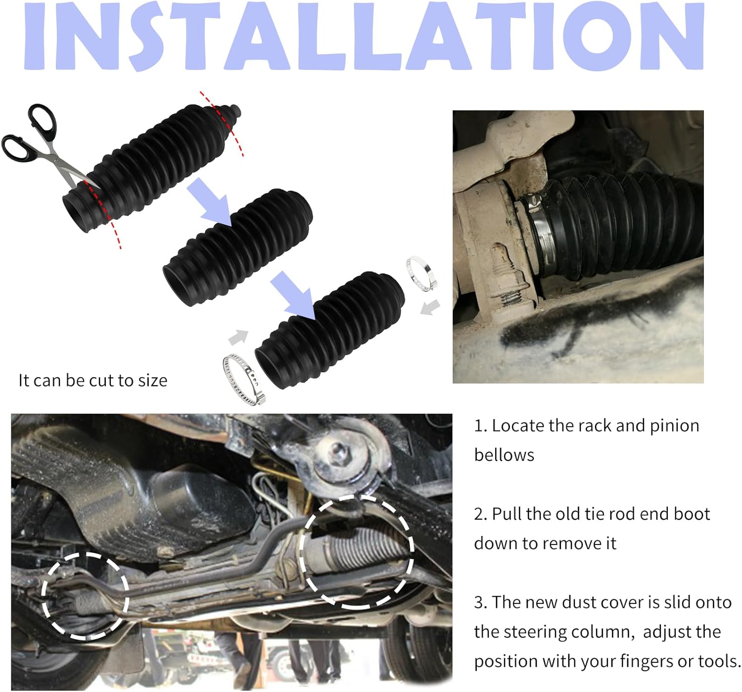- Installation Steps: First, you need to locate the rack and pinion bellows, then pull the old tie rod end boot down to remove it, then the new dust cover is slid onto the steering column, and you can adjust the position slightly with your fingers or tools