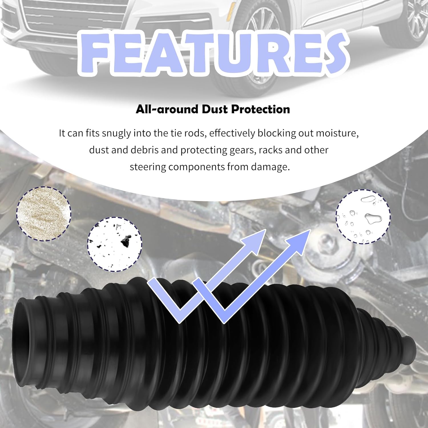 - All-around Dust Protection: Silicone is a tough and flexible material that fits snugly into the tie rods, effectively blocking out moisture, dust and debris and protecting gears, racks and other steering components from damage