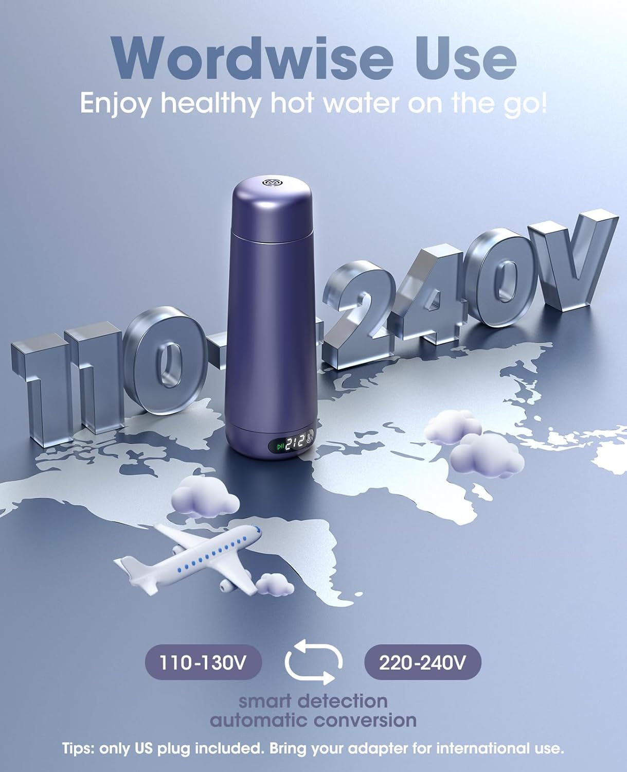 110-240V Portable Electric Kettle: Nicewell portable kettles feature smart voltage technology, plug and play, automatically adapt to the global voltage 110-240V, travel abroad no longer need to worry about the mini kettle can not be used due to different voltages, great for domestic and international travel and business trip. (NOTE: ONLY comes with US cord, please bring your plug adapter when you traveling abroad)