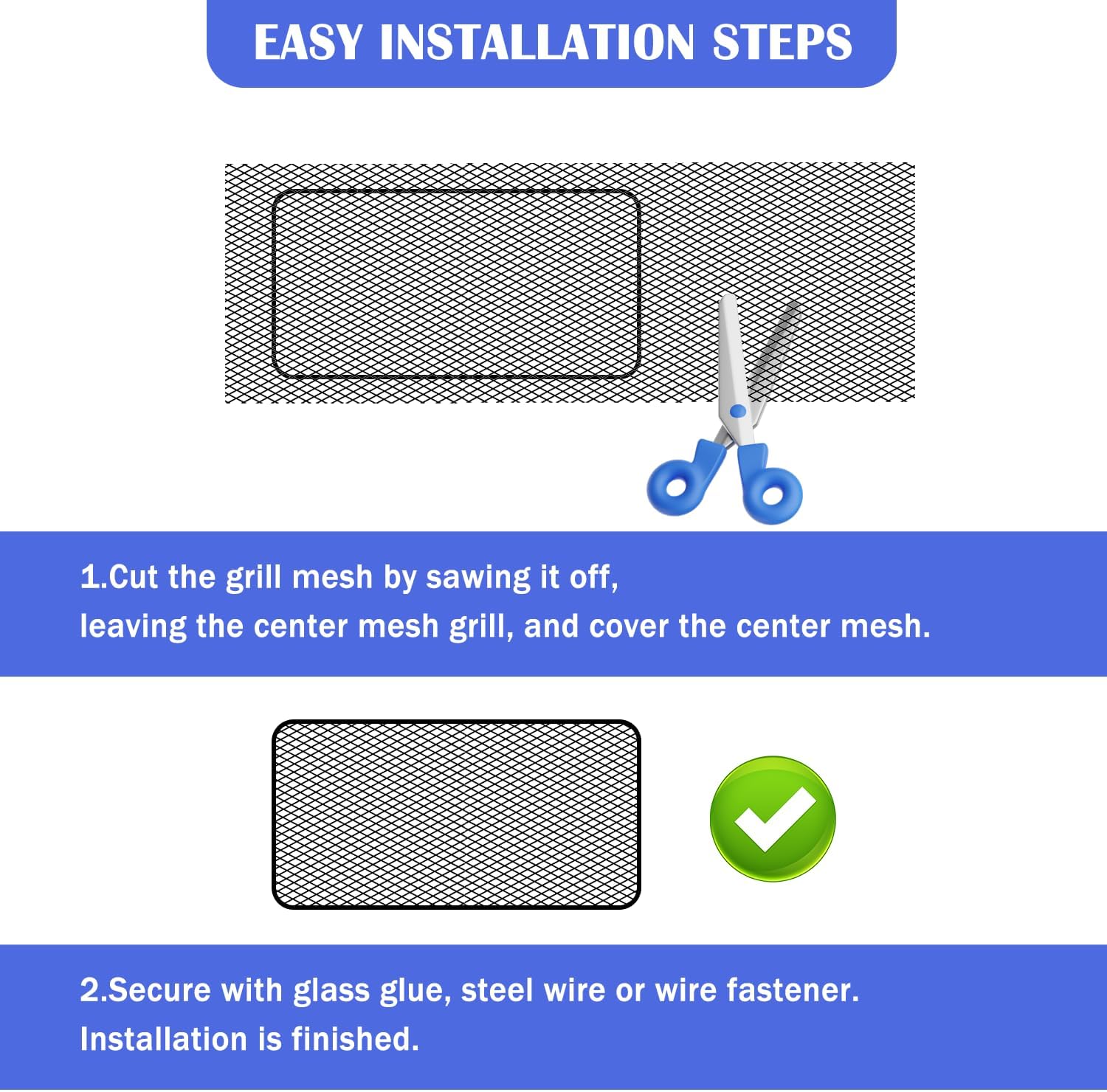 - [Easy Installation Steps]-Use the grill mesh cutting tools such as large scissors, tin snips and wire snippers to crop car mesh grill according to your needs. Cut the grill mesh by sawing it off, leaving the center mesh grill, and cover the center mesh. Secure with glass glue, steel wire or wire fastener. Installation is finished.