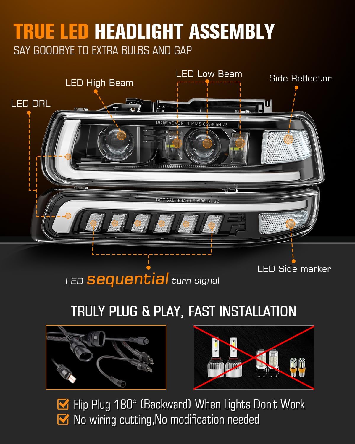 - The Latest Upgrade LED Headlights: Integrated LED headlights are designed with the newest LED chip bulbs and high-quality housing, OEM replacement, more convenient and fast. No need to worry about the difficult installation of bulbs and housings or inappropriate hole positions.