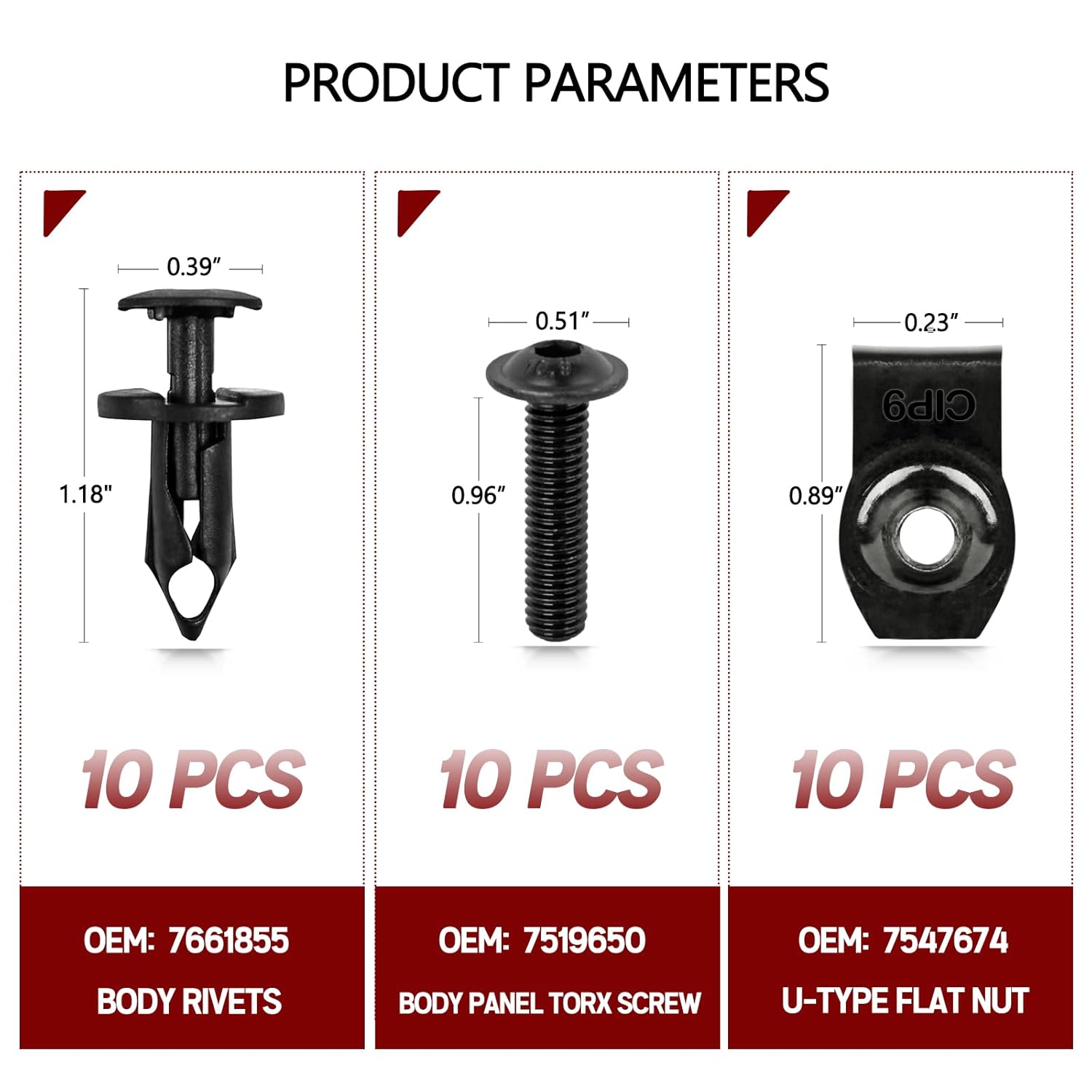 - This set of products consists of 30 pieces, including 10pcs screws to replace Polaris part number 7519650, 10pcs flat nuts to replace 7547674, 10pcs plastic rivets to replace 7661855, affordable and value-for-money set combination