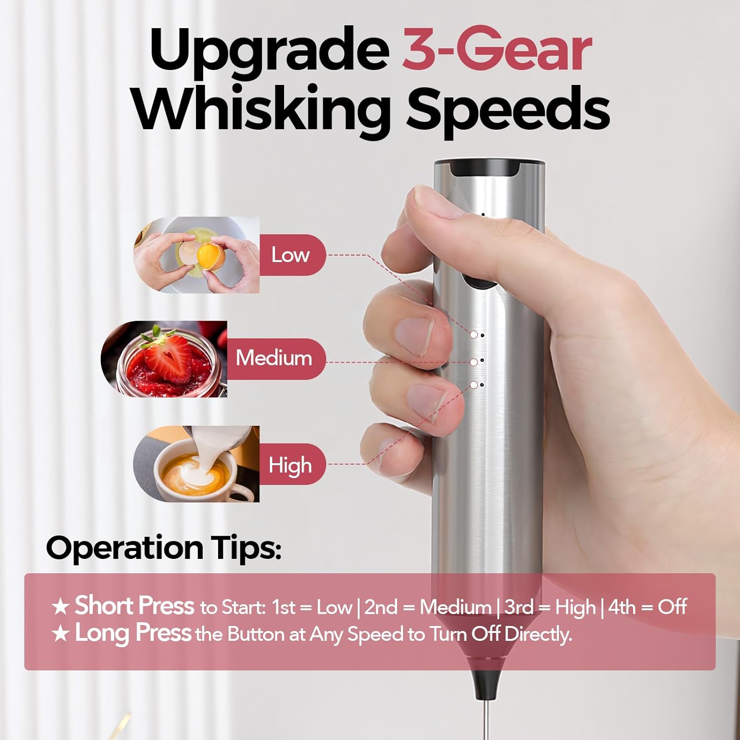 3-Speed Control & Quick Frothing: This coffee frother has three speed settings (high/middle/low) for precise control, to achieve the ideal foaming effect. Our coffee frother handheld effortlessly creates creamy foam for coffee and blends beverages in 15-20 seconds with minimal noise