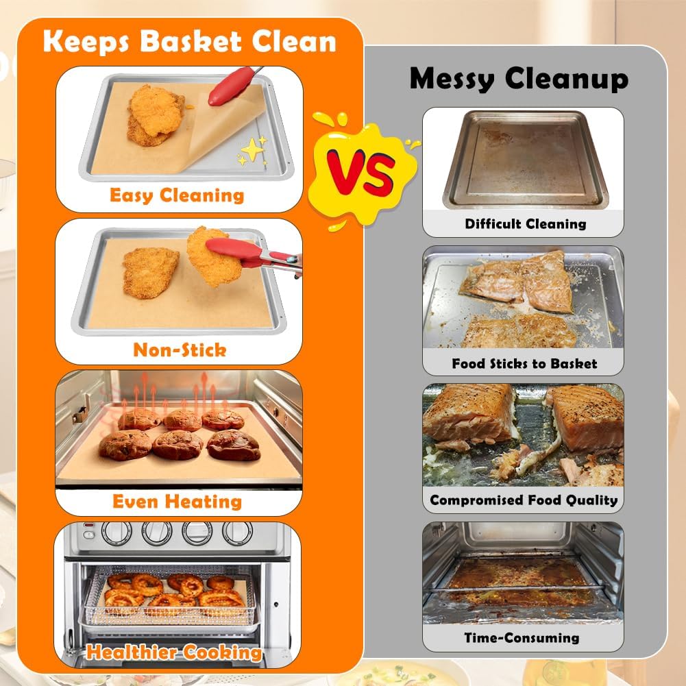 Non-Stick and Mess-Free: Prevents food from sticking to trays or baskets while absorbing excess oil, ensuring easy cleanup and keeping your oven or fryer spotless.